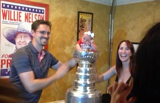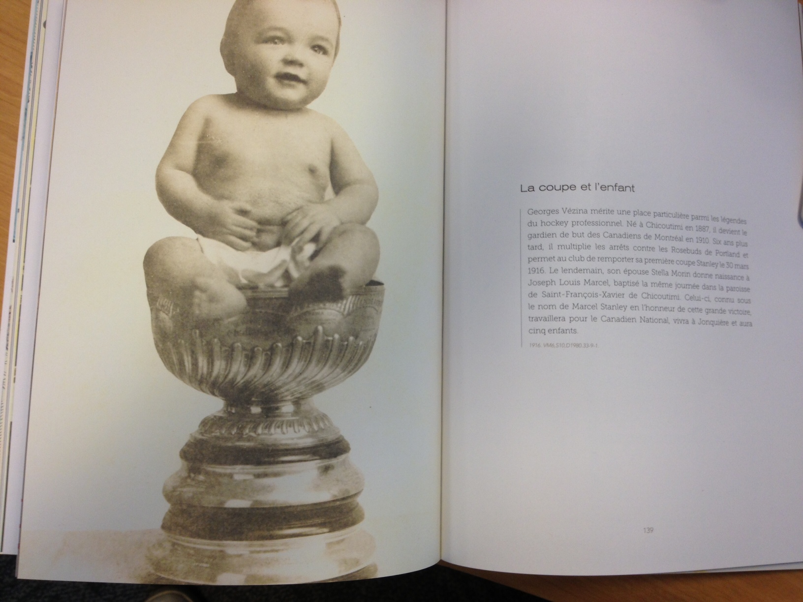 p.138: Sympathique, cette photo de la Coupe Stanley de 1916. C’est 10 ans avant que la Coupe ne soit acquise par la LNH et environ quatre ans avant qu’on demande aux vainqueurs d’y ajouter, à chaque fois, un anneau supplémentaire. À l’époque on pouvait donc encore y faire trôner son bébé sans avoir peur qu’il se casse la gueule de trop haut!