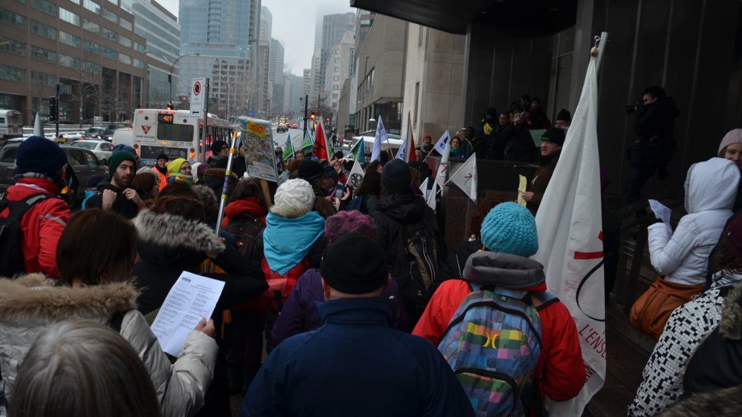Une vingtaine de personnes de la Coalition opposée à la tarification et à la privatisation des services publics ont occupé les bureaux d’Hydro-Québec, mardi matin. Les manifestants demandent au gouvernement Marois d’annuler «la hausse du tarif du bloc patrimonial d’électricité» prévue pour 2014.
