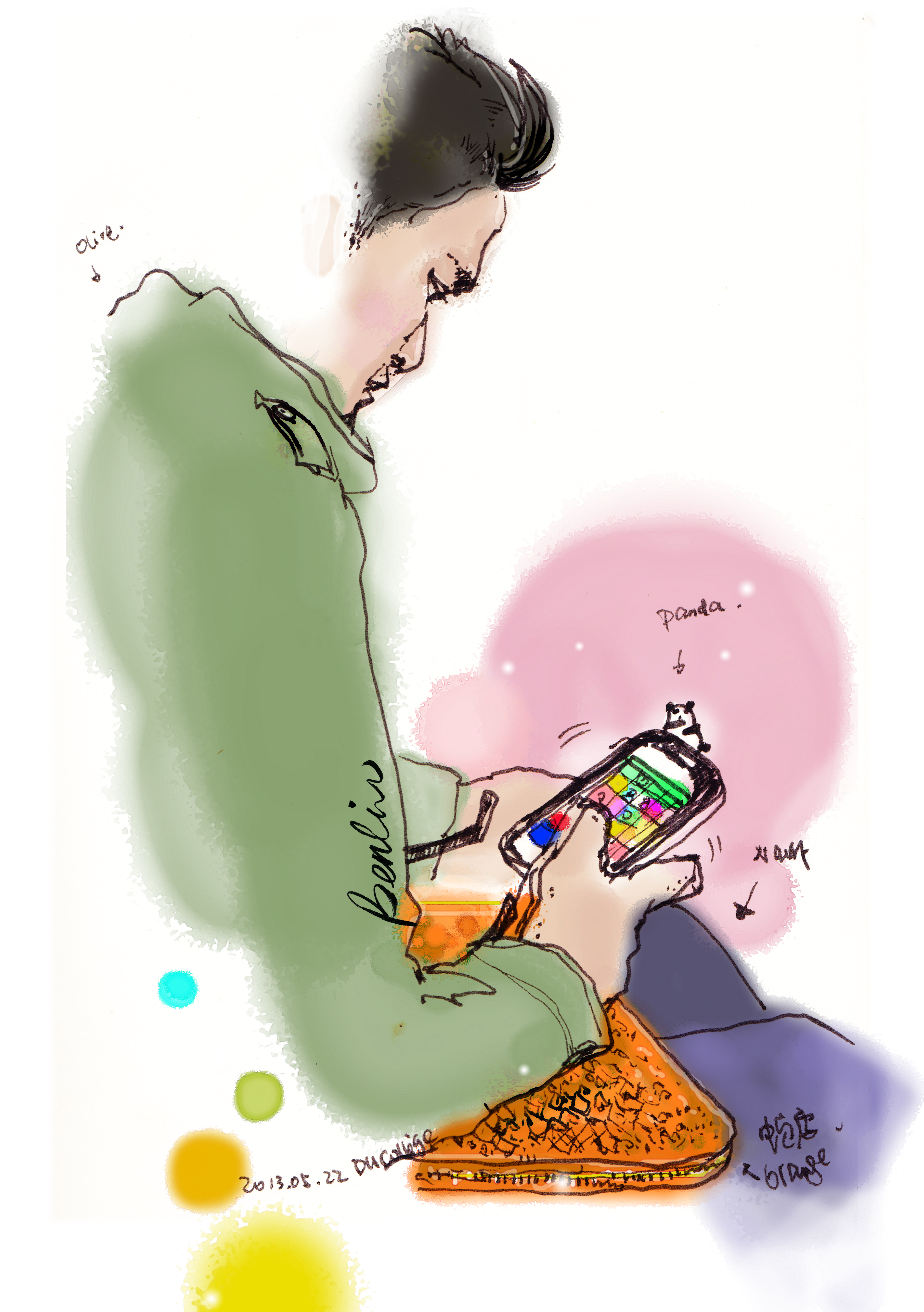 «J’espère que ça ne vous dérange pas, je vous ai dessiné.» Le panda couché sur l’étui de son iPhone m’a rassuré.
