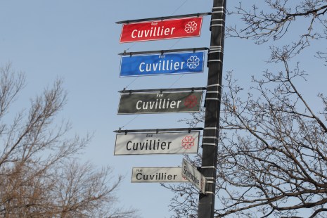 Au coin des rues Sherbrooke et Cuvillier, dans l’arrondissement de Mercier–Hochelaga-Maisonneuve, une équipe d’ingénieurs de la Ville cherche à déterminer quel format, quel lettrage et quelle hauteur rendront les plaques plus lisibles.