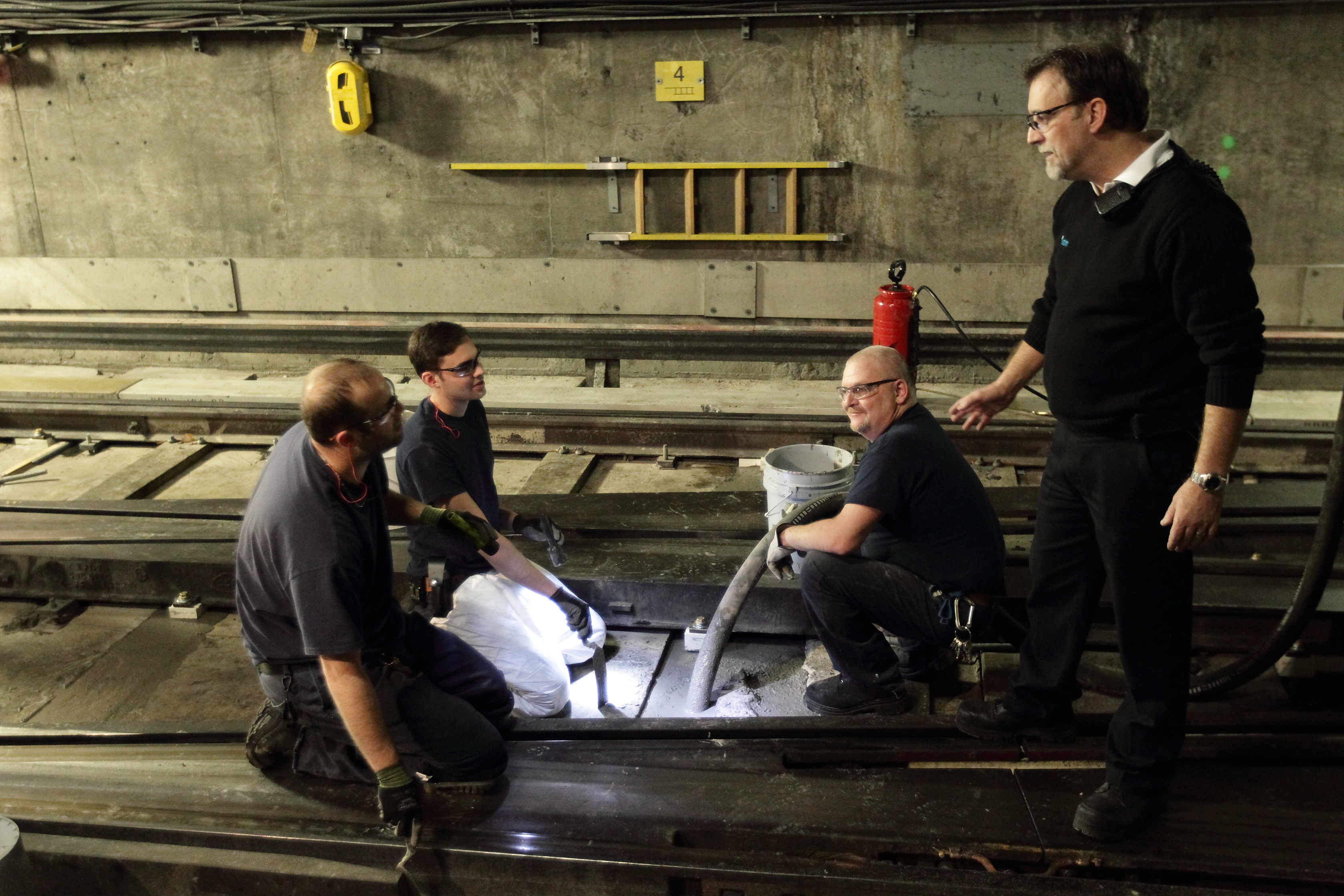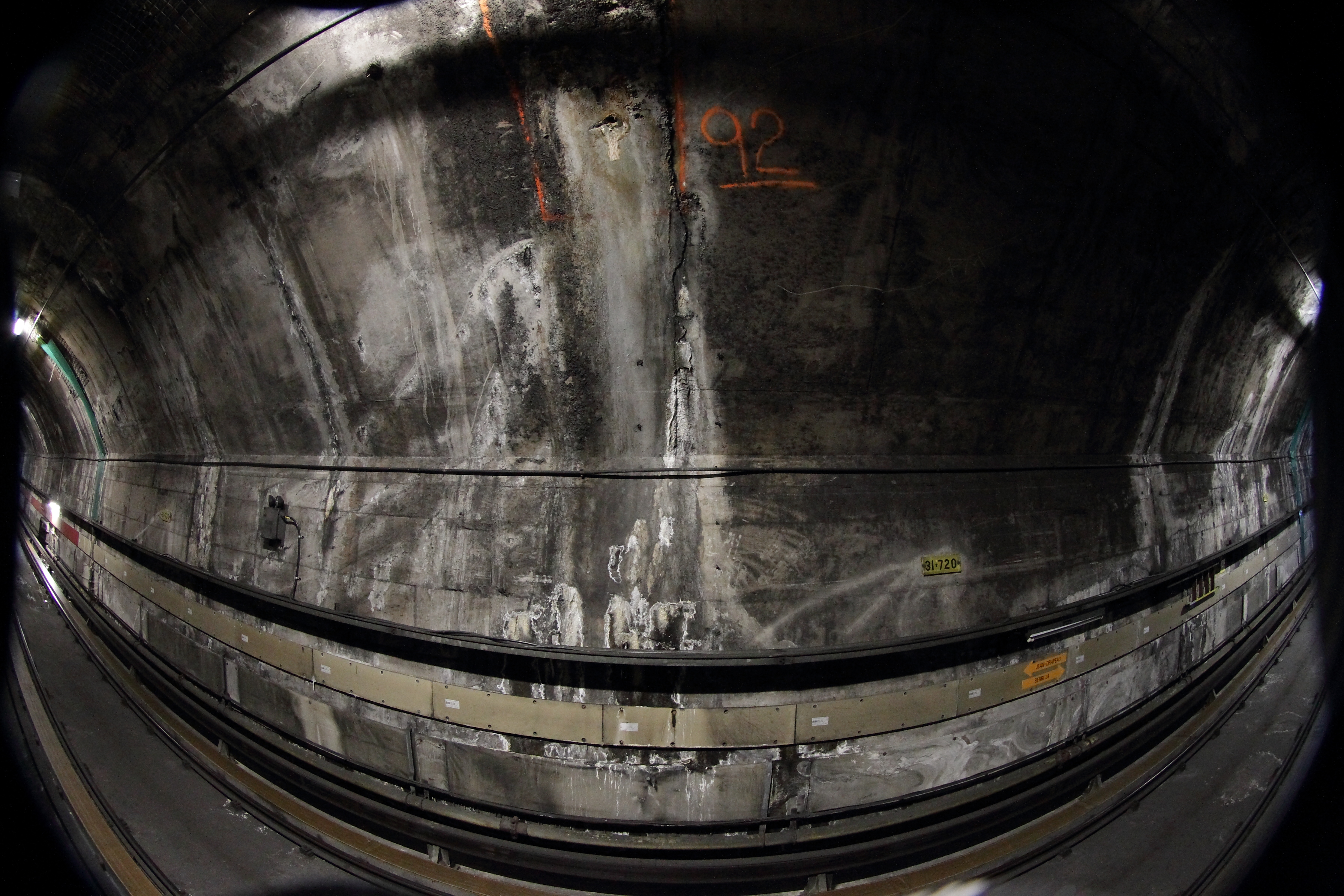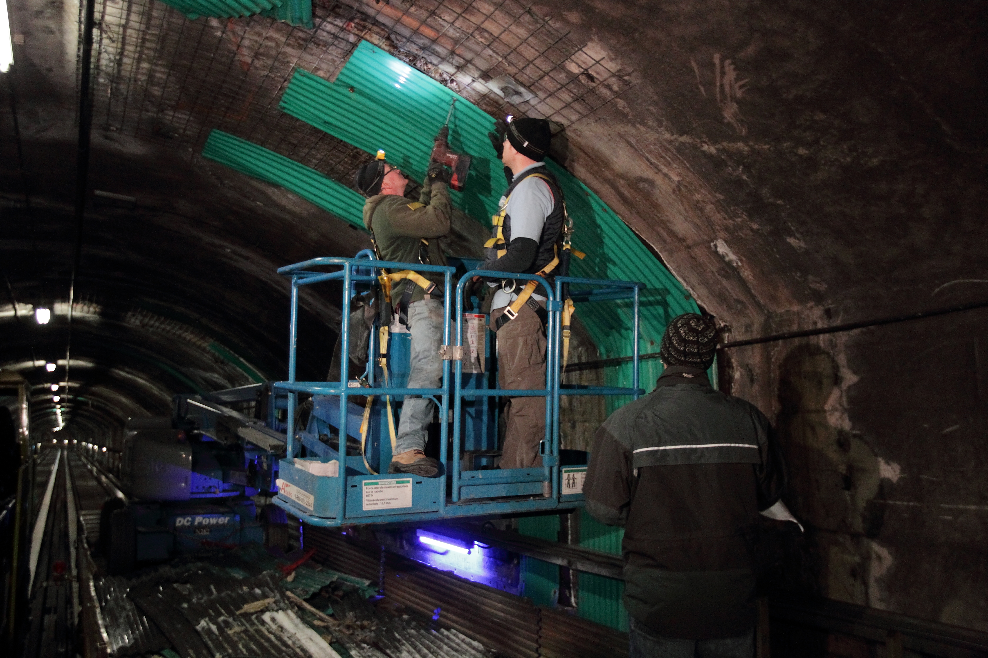 À 130 pieds sous la surface du fleuve St-Laurent, entre la station Berri-UQAM et Jean-Drapeau, les parois de béton du tunnel de la ligne jaune sont placardées de panneaux de plastique vert recouvrant les fissures majeures de la structure. Quand le silence s’installe, le ruissellement de l’eau des canalisations est clairement audible et quelques gouttes du plafond atterrissent même sur la tête des travailleurs.