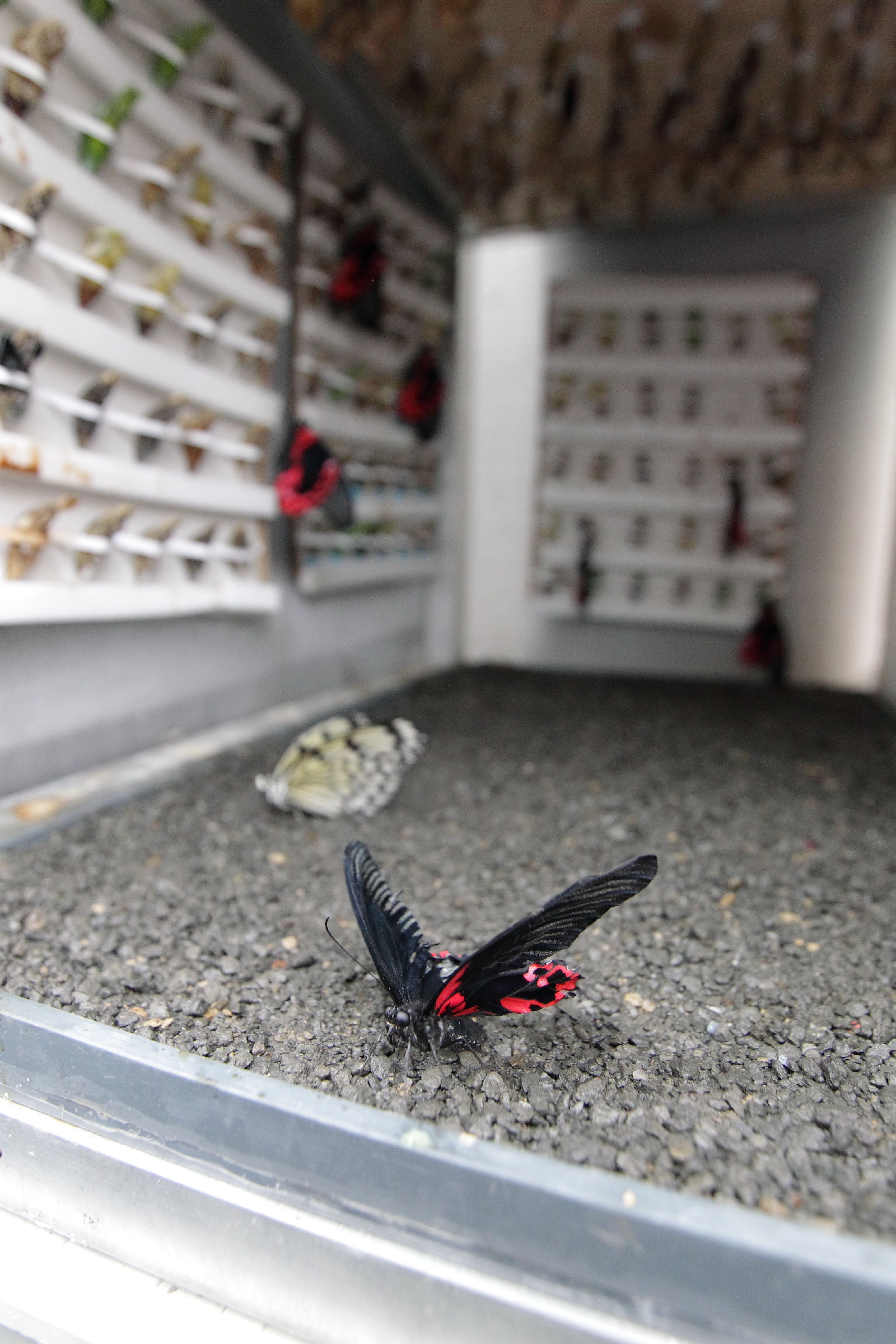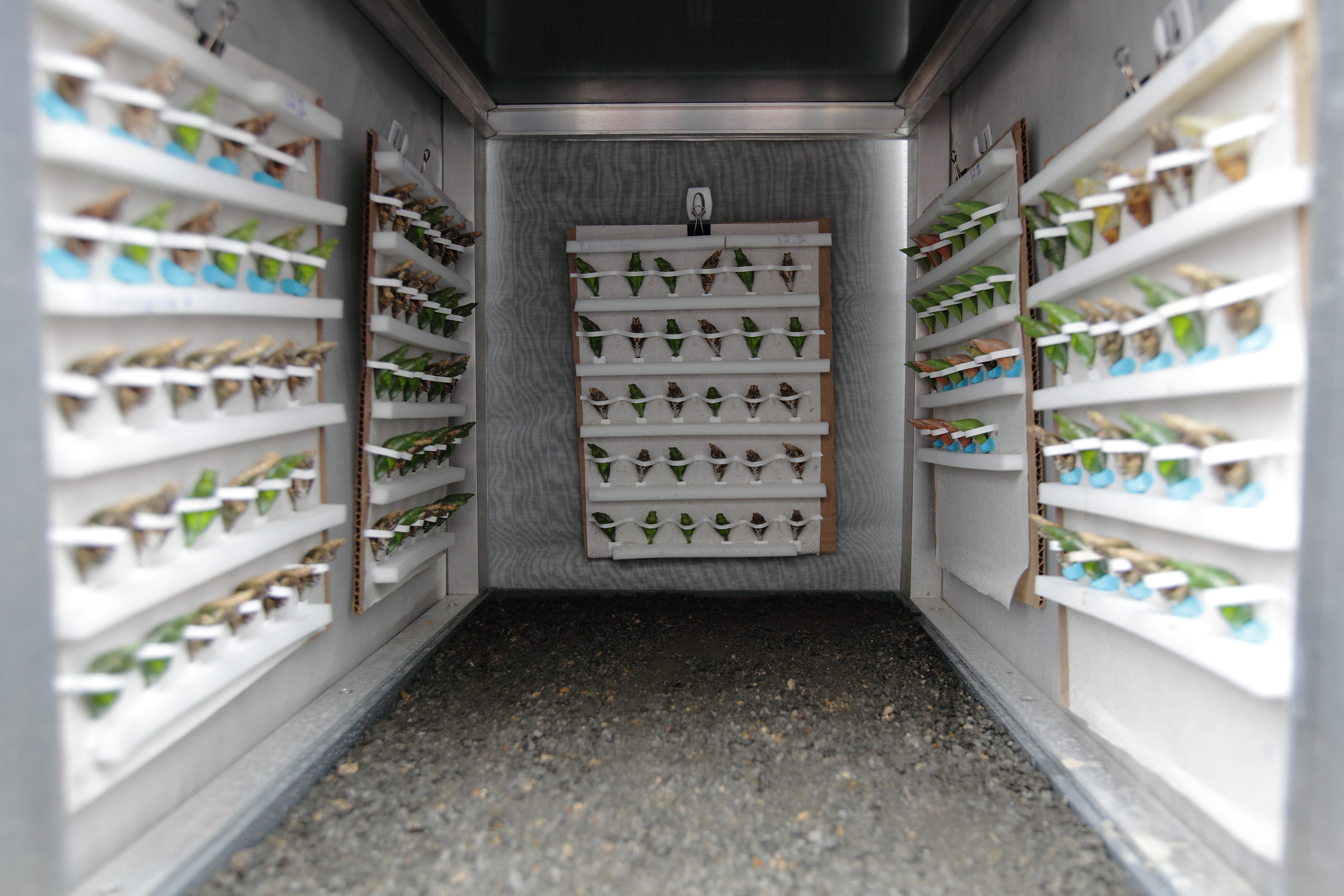Les techniciens de l’Insectarium doivent coller toutes les chrysalides sur des plaquettes en bois, la tête à l’envers, ou les maintenir à l’endroit avec des petites bandelettes. Elles sont déposées, à une humidité régulée, dans des casiers de la serre d’élevage de l’Insectarium. Ainsi bichonnées, les chrysalides ont de 75 à 90% de chance d’éclore, contre 10 à 40% dans la nature. Environ 1500 insectes peuvent être maintenus dans ces casiers en même temps, et de 150 à 200 éclosent quotidiennement, après y avoir reposé trois ou quatre jours. Les papillons sont alors acheminés jusqu’à la grande serre d’exposition.