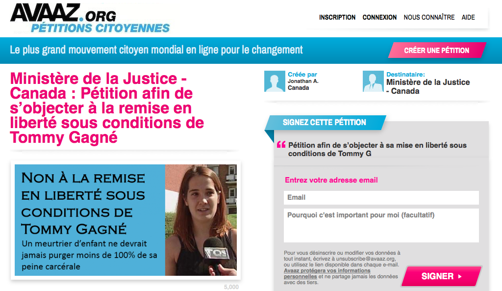 Sur la page Internet où est présentée cette pétition, il est écrit qu’un meurtrier d’enfant ne devrait jamais purger moins de 100 pour cent de sa peine carcérale.
