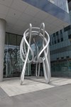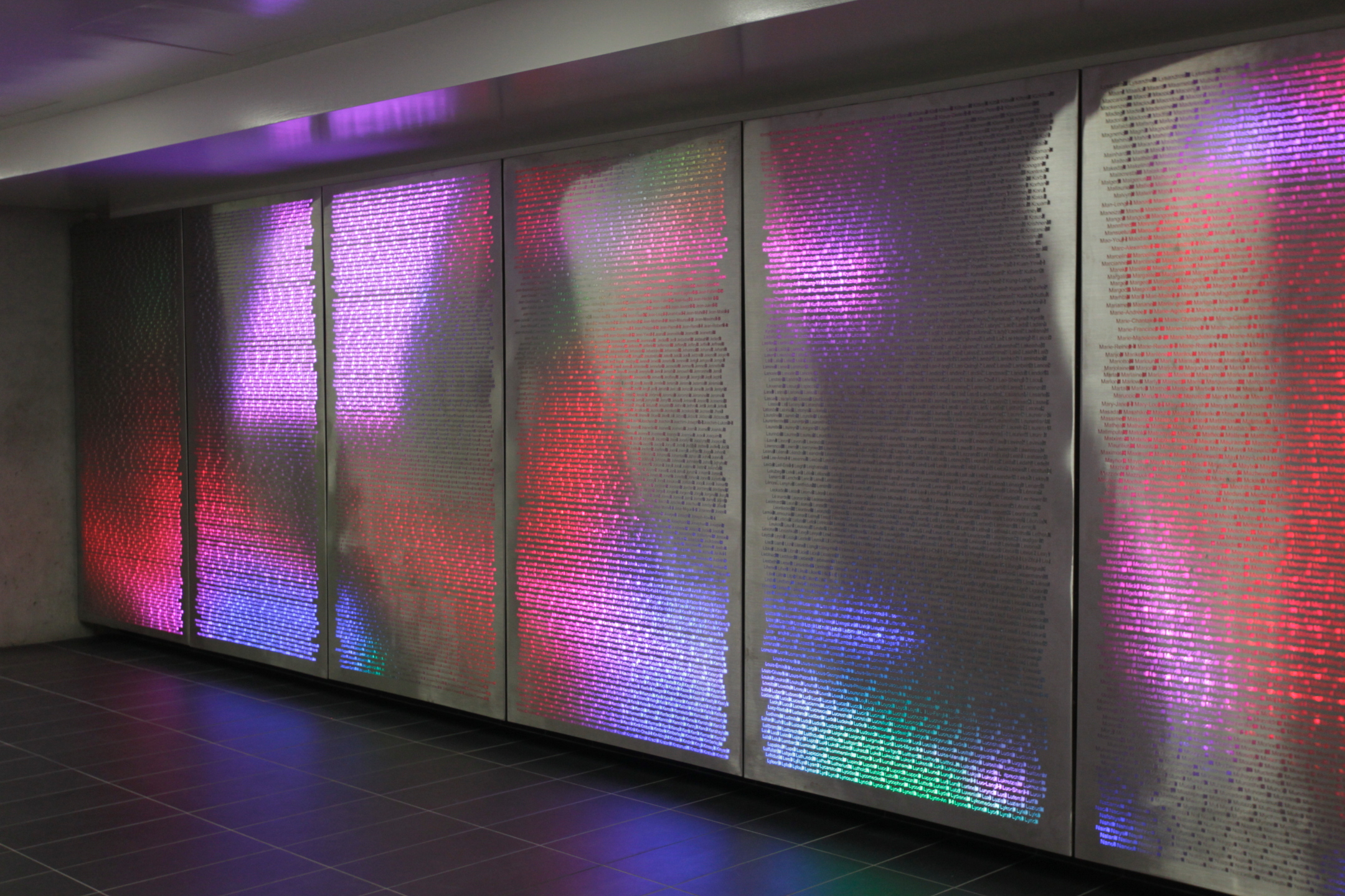Il s’agit de la sculpture extérieure Les jeux de ficelles, de Pierre Bourgault, de la murale illuminée Jardins et jardiniers du monde, de Michel Goulet, de la toile Premiers arrivants, de François Vincent et des fresques Tessellations sans fin d’Alain Paiement.