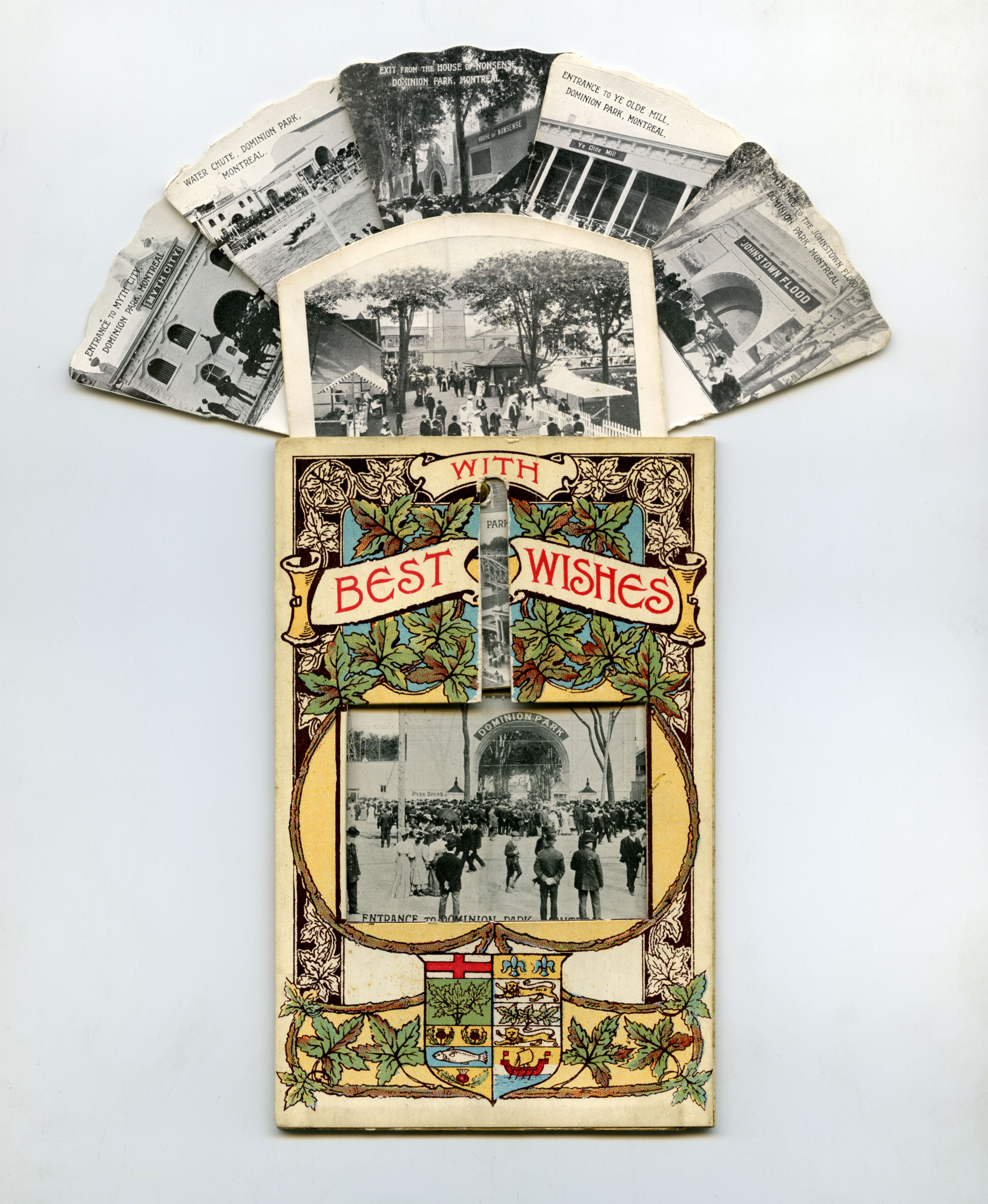 Savez-vous que nombre de cartes postales de Montréal nous renseignent sur l’histoire et la représentation de la ville à différentes époques et sur les changements survenus depuis plus d’un siècle dans le paysage urbain, dans le mode de vie des Montréalais et dans leurs pratiques sociales et culturelles? La carte postale du parc Dominion de Montréal a été imprimée en Grande-Bretagne en 1906. On a utilisé pour la créer le procédé d’encre de couleur sur carton, et ses dimensions sont de 9cm x 14cm. Une fois l’éventail ouvert, ces dimensions atteignent toutefois 21,5cm x 16cm. Il s’agit d’un des plus beaux exemples de carte éventail à système mécanique qui a été produit par la firme écossaise James Valentine and Sons pour le marché québécois.