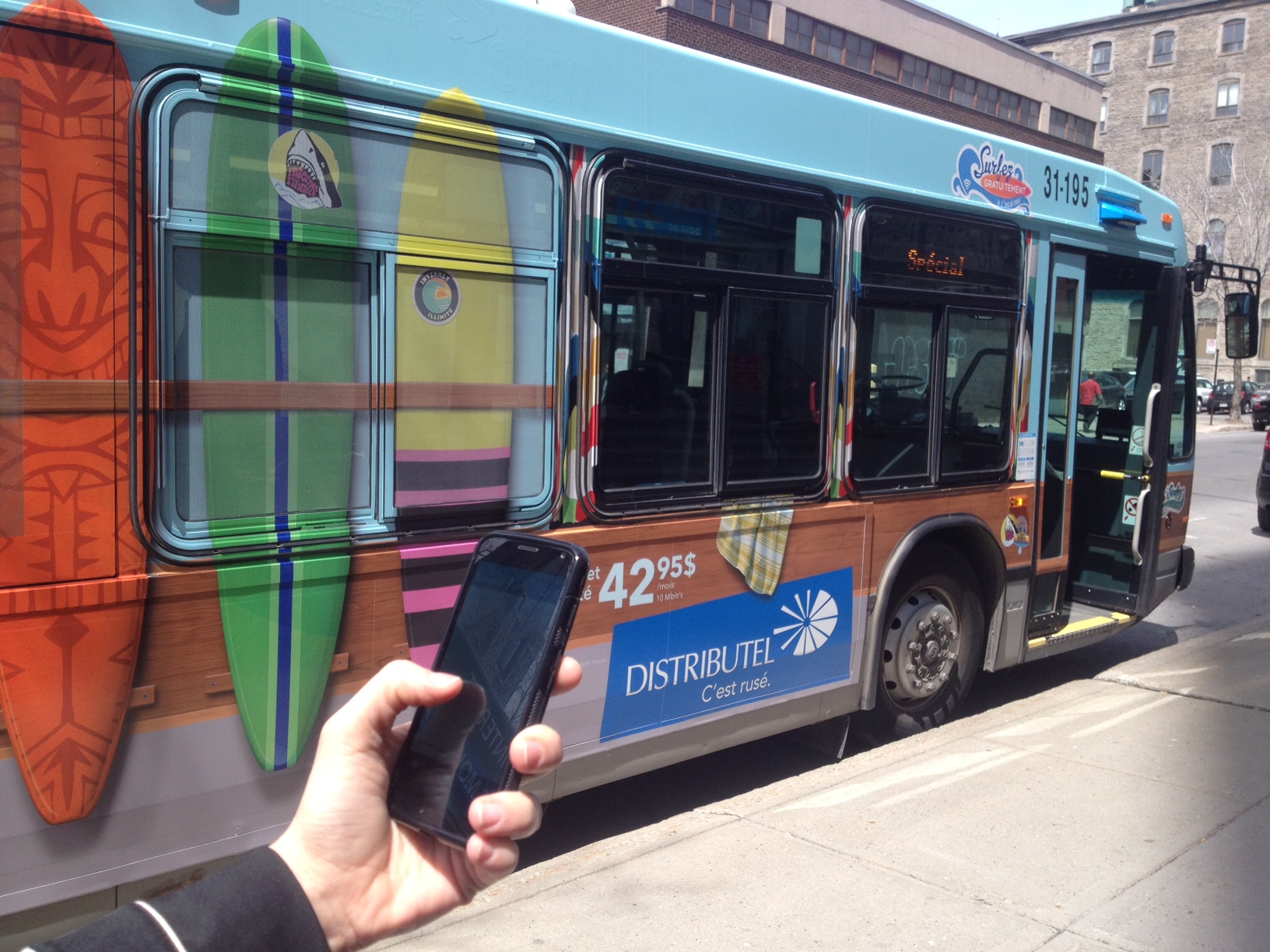 La compagnie de télécommunications Distributel a présenté jeudi un concept publicitaire d’autobus Wi-Fi. Il circulera sur la ligne 150 (René-Lévesque) dès le 8 mai. Les lignes 24 (Sherbrooke) et 10 (De Lorimier) suivront cet été.
