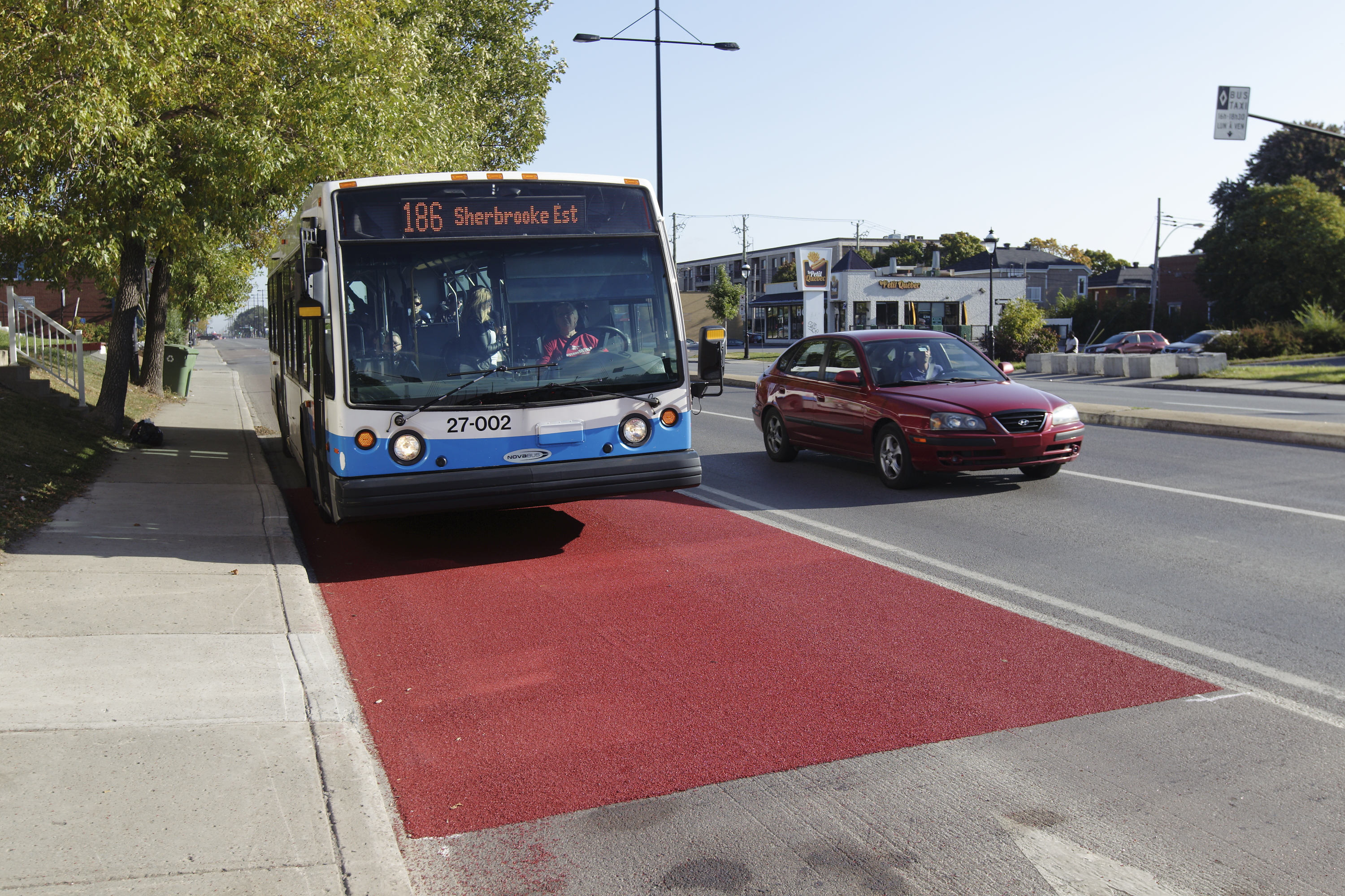 Au cours des prochains mois, la Ville vérifiera si la couleur résistera à l’hiver et au passage fréquent des autobus. Près de 350 autobus de la Société de transport de Montréal circulent matin et soir sur la voie réservée de la rue Sherbrooke.
