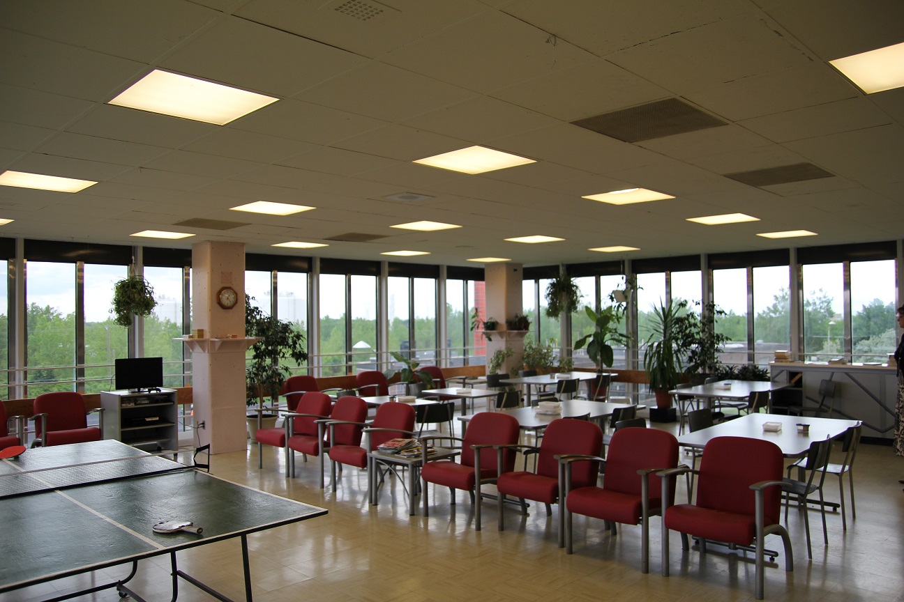 De l’autre côté du poste de sécurité se trouve l’espace commun, soit une grande pièce vitrée avec vue sur la cour et le stationnement. L’art prend une grande place à l’institut et plusieurs murs sont recouverts d’une murale qui évoque toujours les grands espaces.