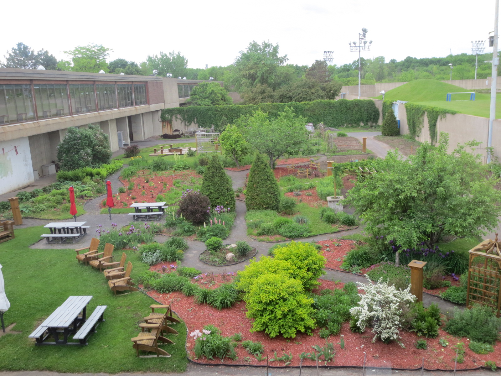 Au centre se trouve un immense jardin fleuri, muni de chaises et de tables à pique-nique, ainsi que d’un potager entretenu par les patients. Un espace est également réservé pour les sports.
