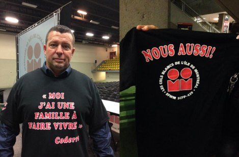 Comme première étape, les cols blancs arboreront dès mercredi un nouveau chandail de leur syndicat avec l’inscription «Moi j’ai une famille à faire vivre» sur le devant, et «Nous aussi» à l’arrière. Il s’agit d’une allusion à une entrevue que le maire de Montréal, Denis Coderre, a accordé à l’émission de Christiane Charette 125, Marie-Anne, cet automne. Questionné sur la possibilité d’abandonner sa pension du gouvernement fédéral, du temps où il était député, le maire a répondu qu’il avait «une famille à faire vivre».