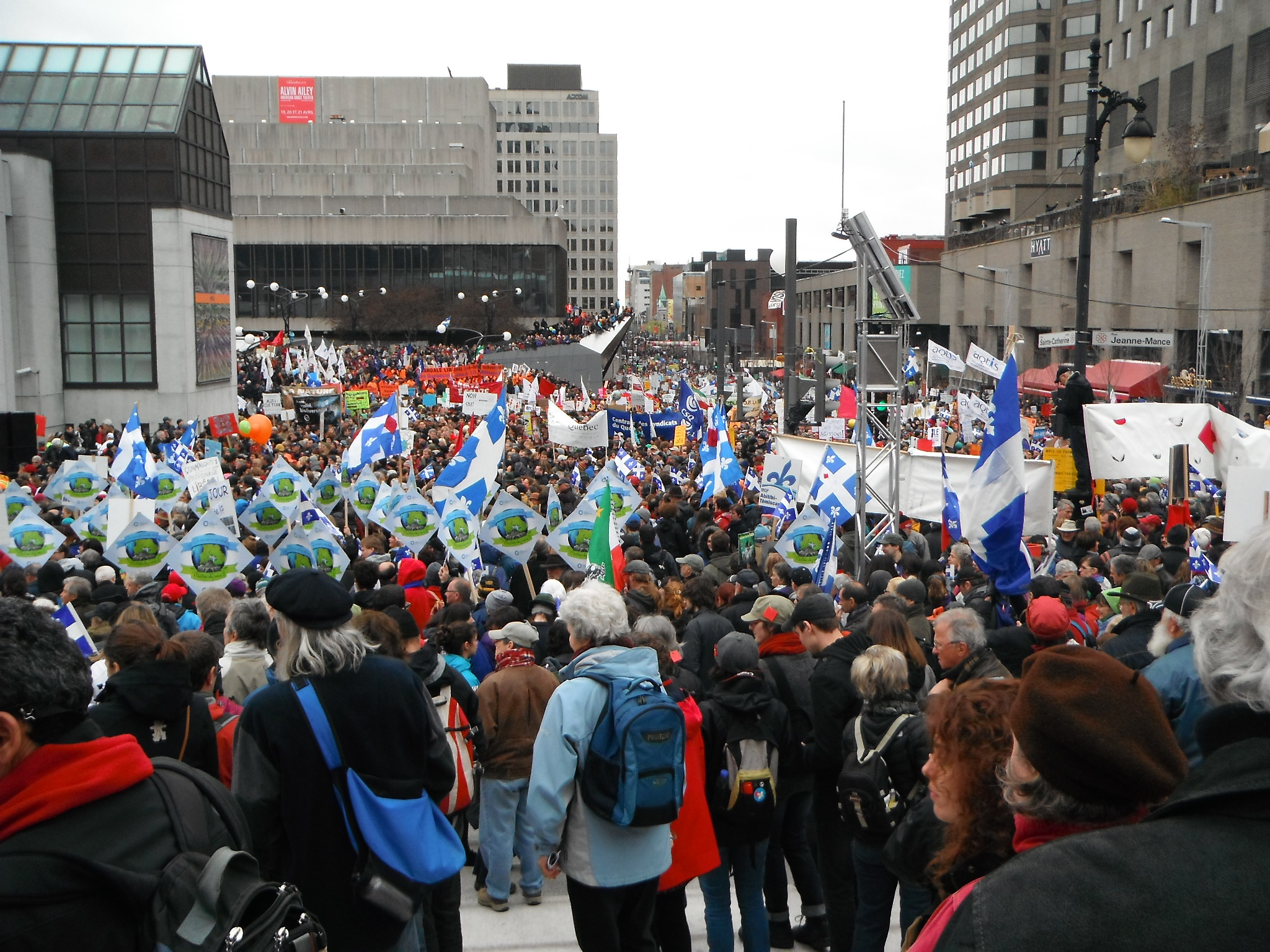 À 14h05, Dominic Champagne lit la déclaration qui a rassemblé 250 000 personnes en ce jour gris et froid. La foule est devenue si importante, qu’elle a maintenant poussé la tête de la marche à mi-chemin entre les rues Ontario et Sherbrooke. Nous n’arrivions même pas à entendre Dominic.