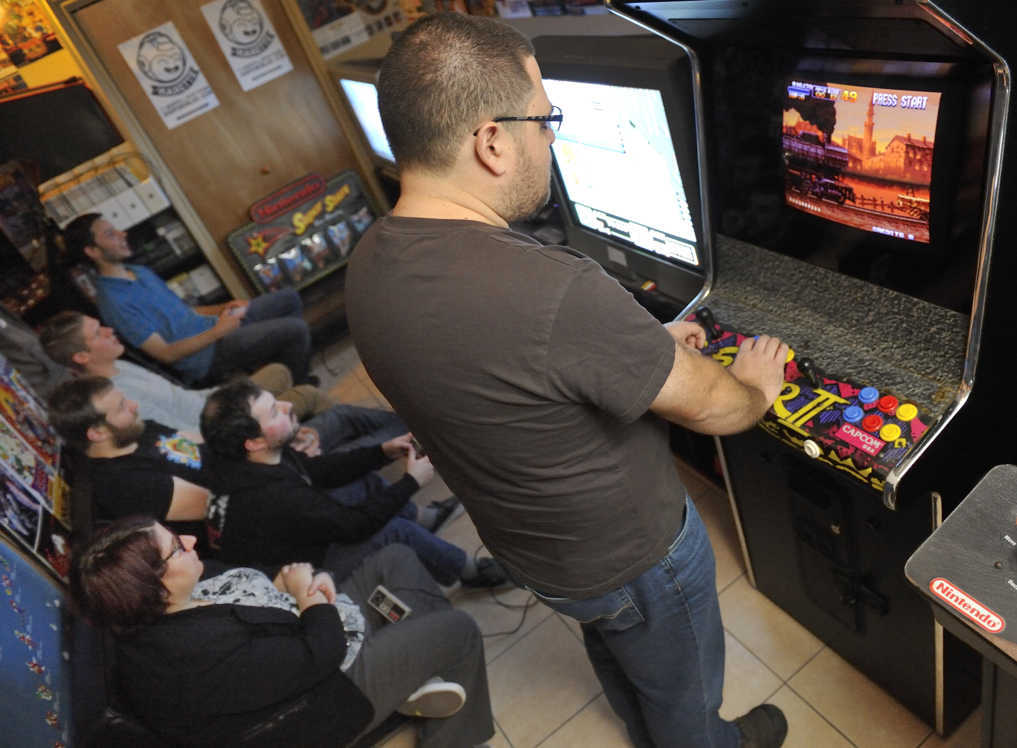 Dès 19h, des rétrogameurs s’installent devant une des 6 bornes d’arcade ou des 10 consoles de jeux vidéo – Nintendo, Atari, Genesis, Play-Station, Super Nintendo – qui composent l’arsenal de Papa Cassette. Sur les murs du petit studio, les personnages de Lethal Enforcers, de Bloody Wolf et d’Armored Warrior fixent les joueurs qui s’activent devant les écrans en poussant des jurons pleins d’entrain. Des centaines de jeux pour tous les goûts garnissent les étagères des bibliothèques.