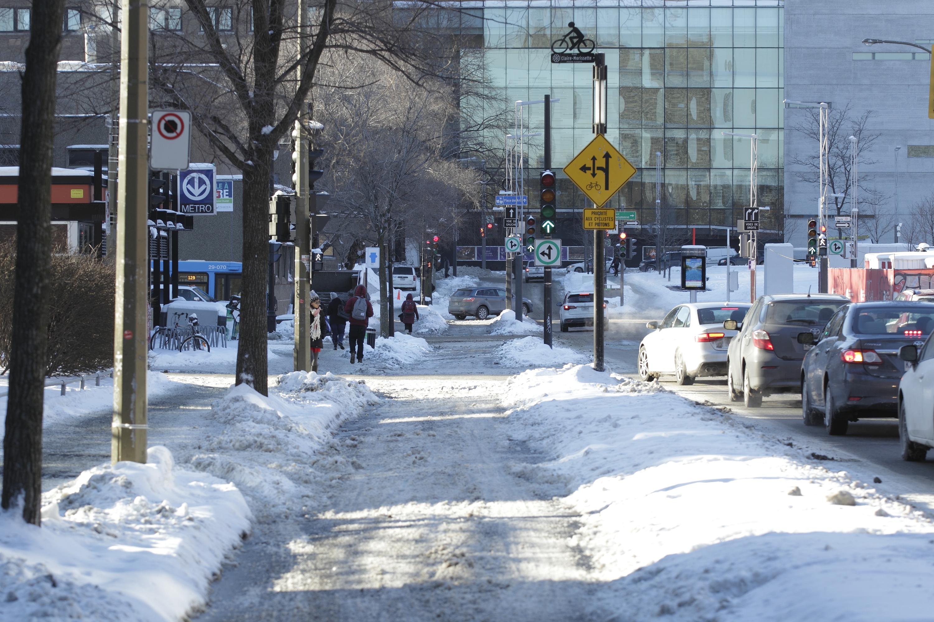 Parmi les trois axes cyclables en site protégé du centre-ville, seul celui sur René-Lévesque est difficile. Mais contrairement aux autres arrondissements lundi matin, Ville-Marie avait pris les choses en main en épandant du sel préhumidifié au chlorure de magnésium, une méthode plus efficace contre la glace.