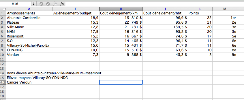Signalons enfin que l’arrondissement d’Ahuntsic-Cartierville a aussi connu des problèmes, alors que dans mon classement il figure en première position pour les investissements en déneigement (insérer ici une pichnotte sur le crâne).