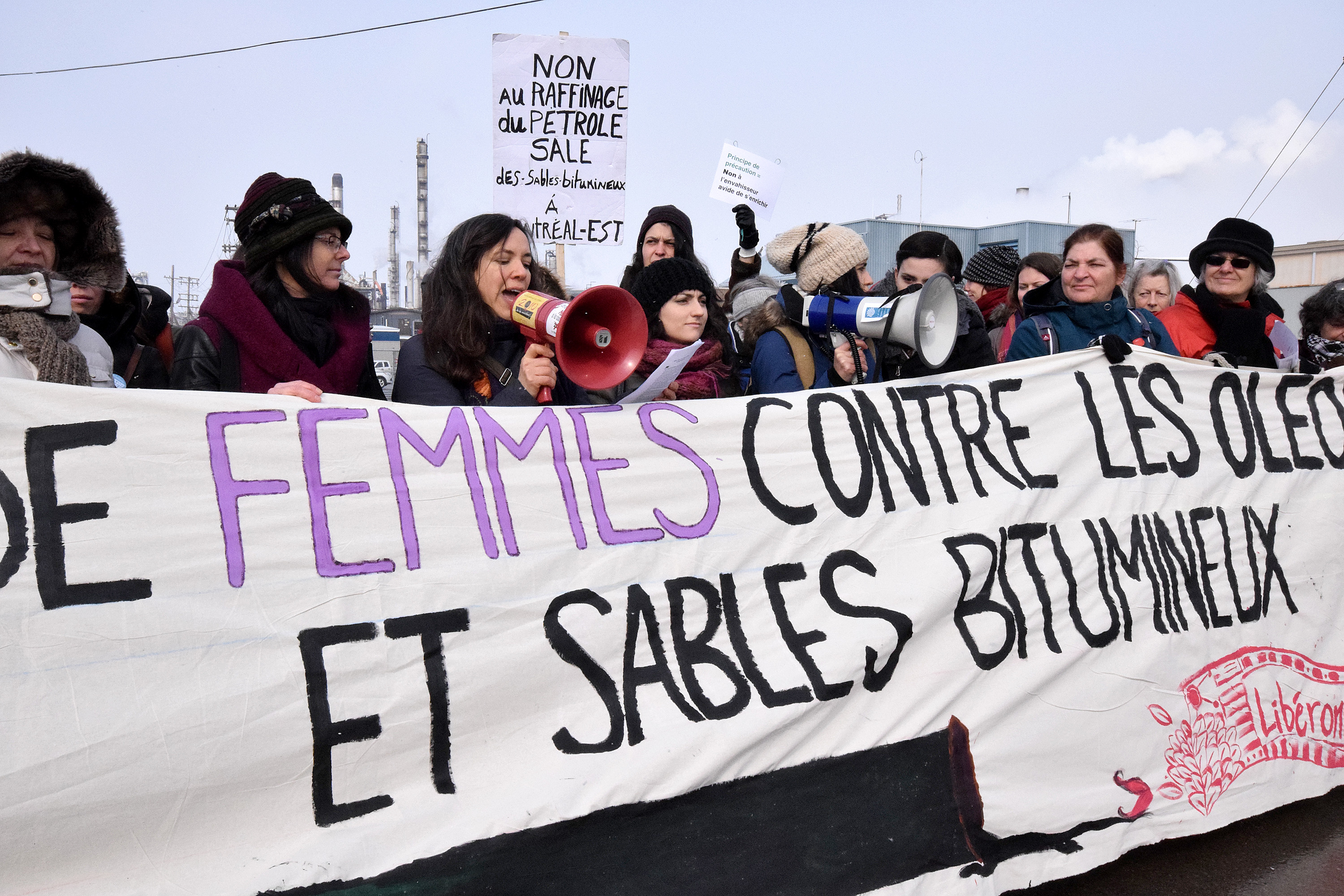 Près de 200 femmes se sont rassemblées aujourd’hui devant la raffinerie Suncor de Montréal-Est afin de manifester leur opposition au raffinage de pétrole des sables bitumineux.