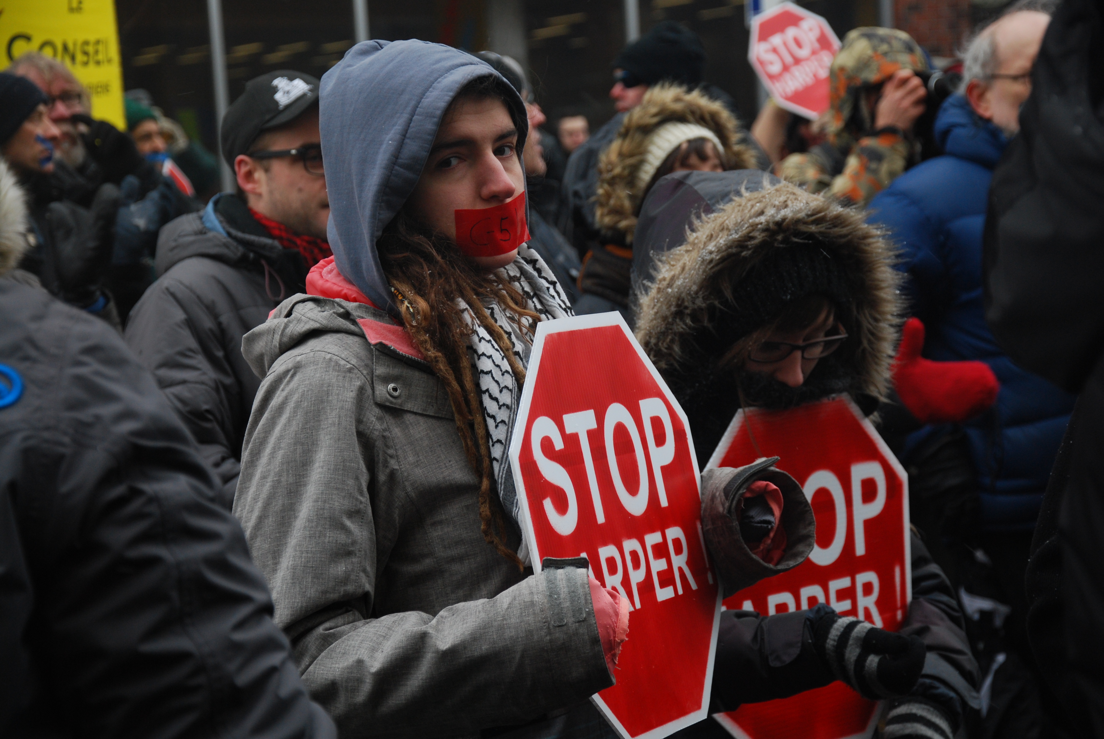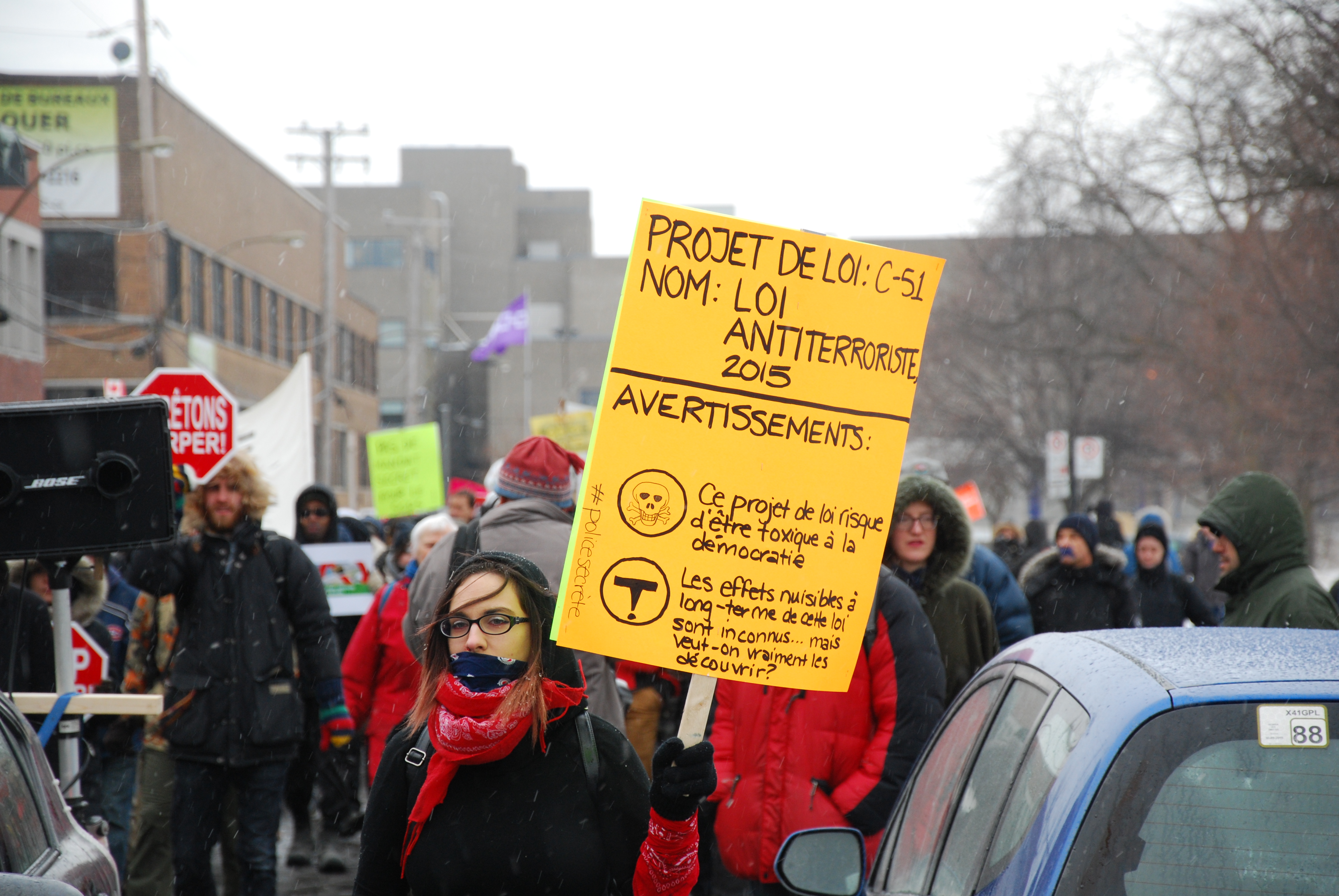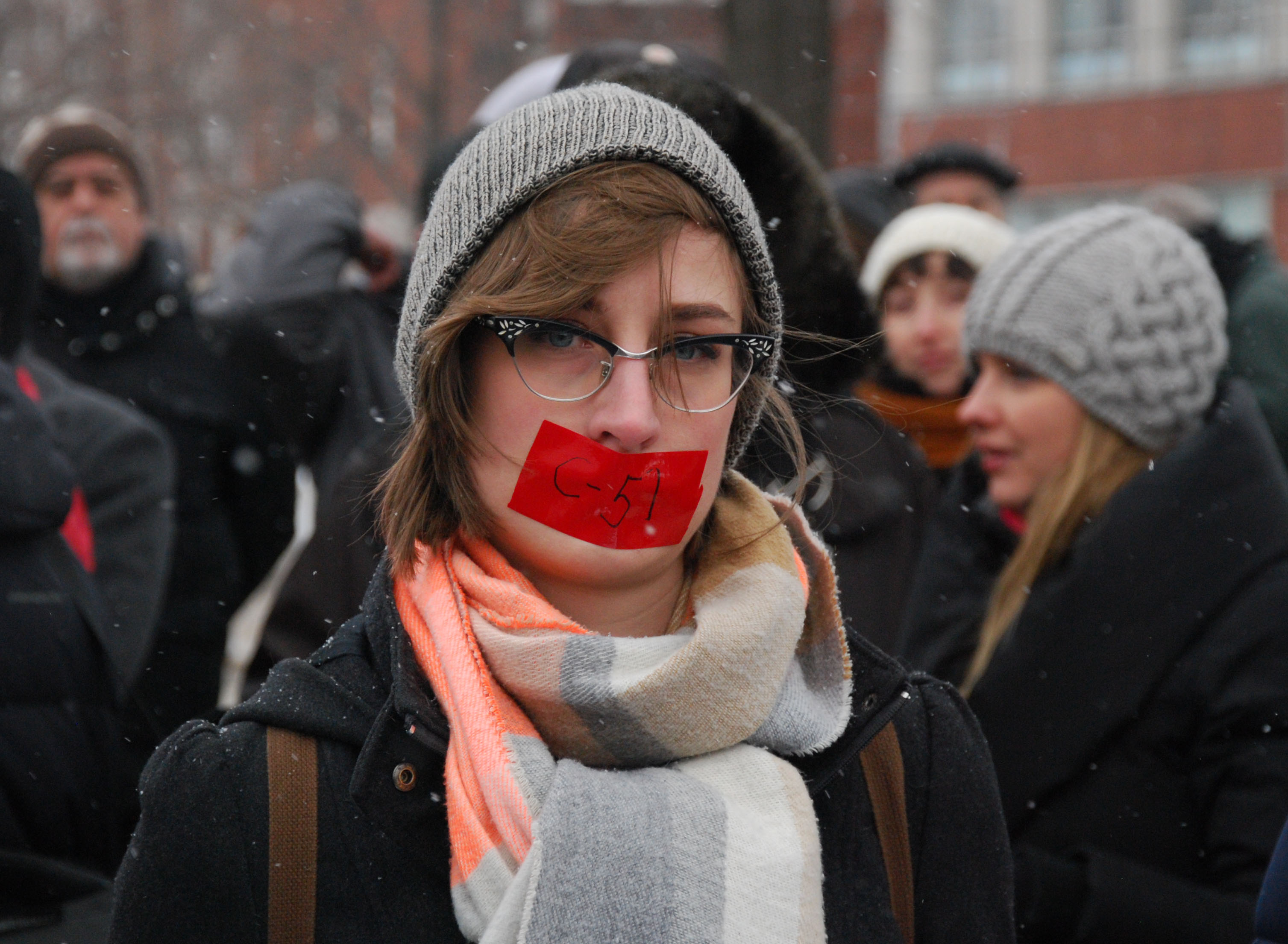 «On veut entamer un mouvement contre C-51, explique à Métro une des organisatrices de la marche, Natasha Tutino. La loi est tellement vague, qu’elle cible tout le monde. Le fait que terroriste et écologiste peuvent dans la phrase, ça n’a pas de sens. Si on laisse ça passer, on aura plus le droit de parler contre le gouvernement.» Afin d’illustrer ce manque de liberté d’expression, plusieurs manifestants étaient bâillonnés avec du papier collant.