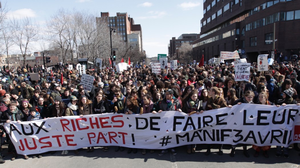MONTRÉAL – Une manifestation pour dénoncer les mesures «d’austérité» du gouvernement Couillard a attiré quelques milliers de personnes — qui ont fait fi des mauvaises conditions climatiques — au parc Émilie-Gamelin, au centre-ville de Montréal, samedi.