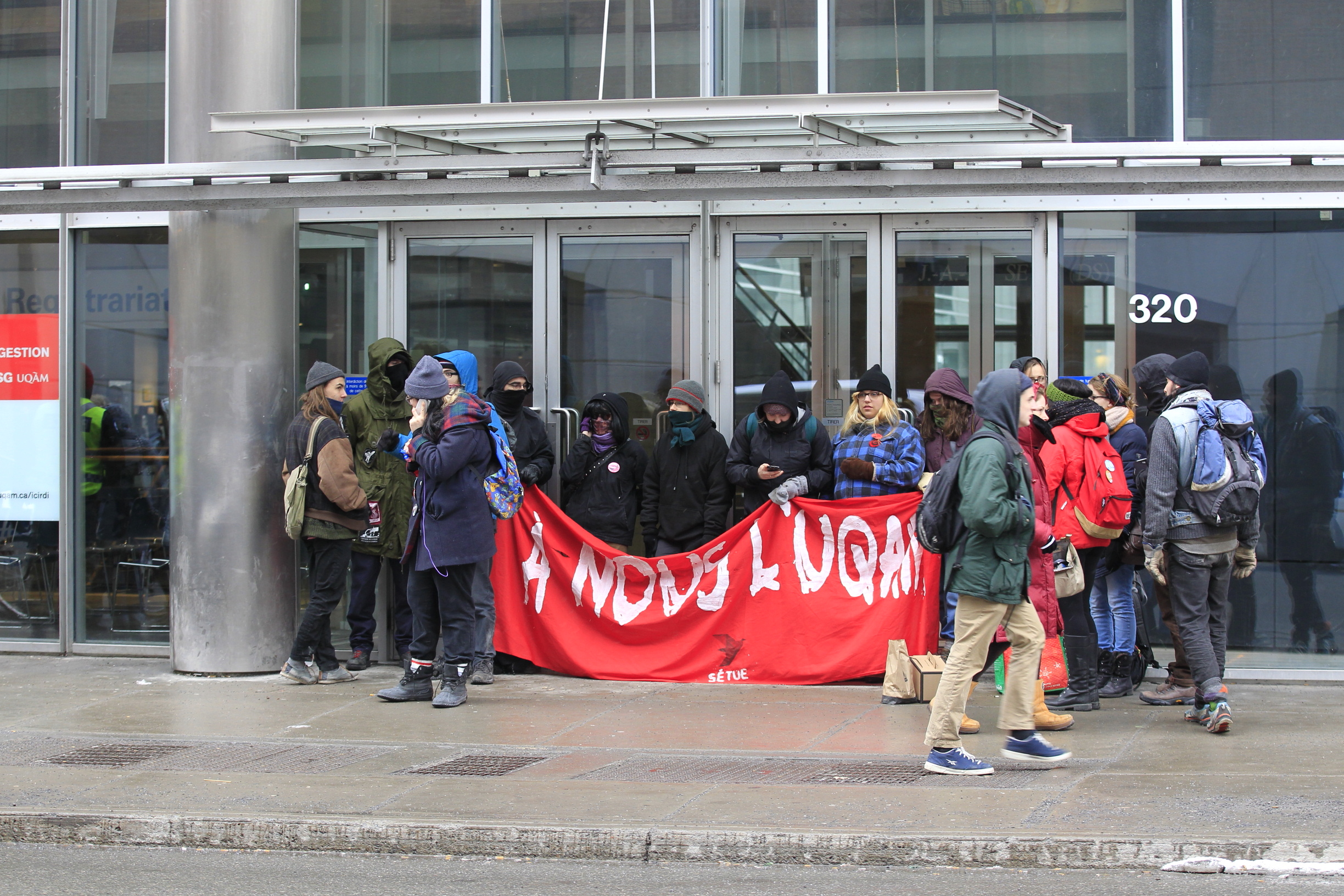 Des petits groupes de manifestants ont été massés devant toutes les portes de l’université jusqu’au milieu de l’après-midi. Certains de ces étudiants de l’UQAM ou même du Cégep du Vieux-Montréal étaient masqués et d’autres non. Ils ont exposé d’immenses banderoles sur lesquelles il était notamment écrit «Aucun cours, évaluation ou remise n’auront lieu aujourd’hui» ou «À nous l’UQAM». Des tracts ont aussi été distribués aux passants pour expliquer leur action.