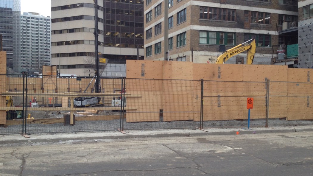 Voici le chantier de la future tour de l’assureur Manuvie. On y trouve presque tout: des affiches design sur les palissades qui permettent de visualiser le projet tout en rendant la vue plus agréable, des informations sur le projet et surtout un numéro de téléphone pour avoir plus de détails. J’ai laissé un message sur la boîte vocale. On verra s’ils sont rapides sur le piton…