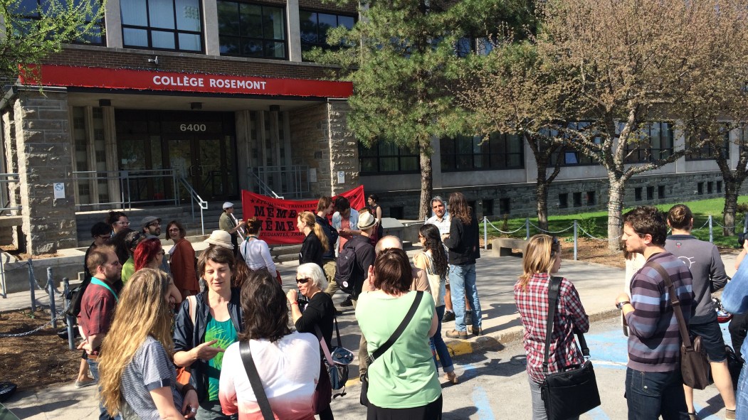 Une cinquantaine de professeurs, étudiants et citoyens se sont rassemblés, jeudi matin, devant le collège de Rosemont, en soutien aux six professeurs suspendus par la direction de l’établissement, en début de semaine.