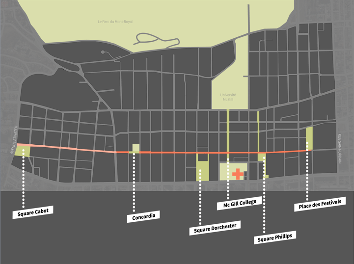 Il propose aussi que la rue McGill College soit piétonnisée, et qu’une sorte d’estrade soit aménagée au pied de la place Ville-Marie, comme à Times Square, à New York. En tout, six places publiques pourraient être aménagées entre le Quartier des spectacles et le Square Cabot, dans l’ouest.
