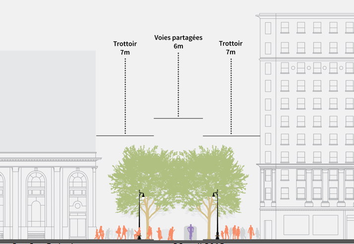 M. Ferrandez croit entre autres que les trottoirs doivent être élargis à 7 mètres de part et d’autre de la chaussée. Cela permettrait d’établir plus de terrasses sur la rue Sainte-Carherine, ce qui est nécessaire pour retenir les quelque 500 000 personnes qui travaillent au centre-ville et qui le quittent lorsque leur quart de travail est terminé.