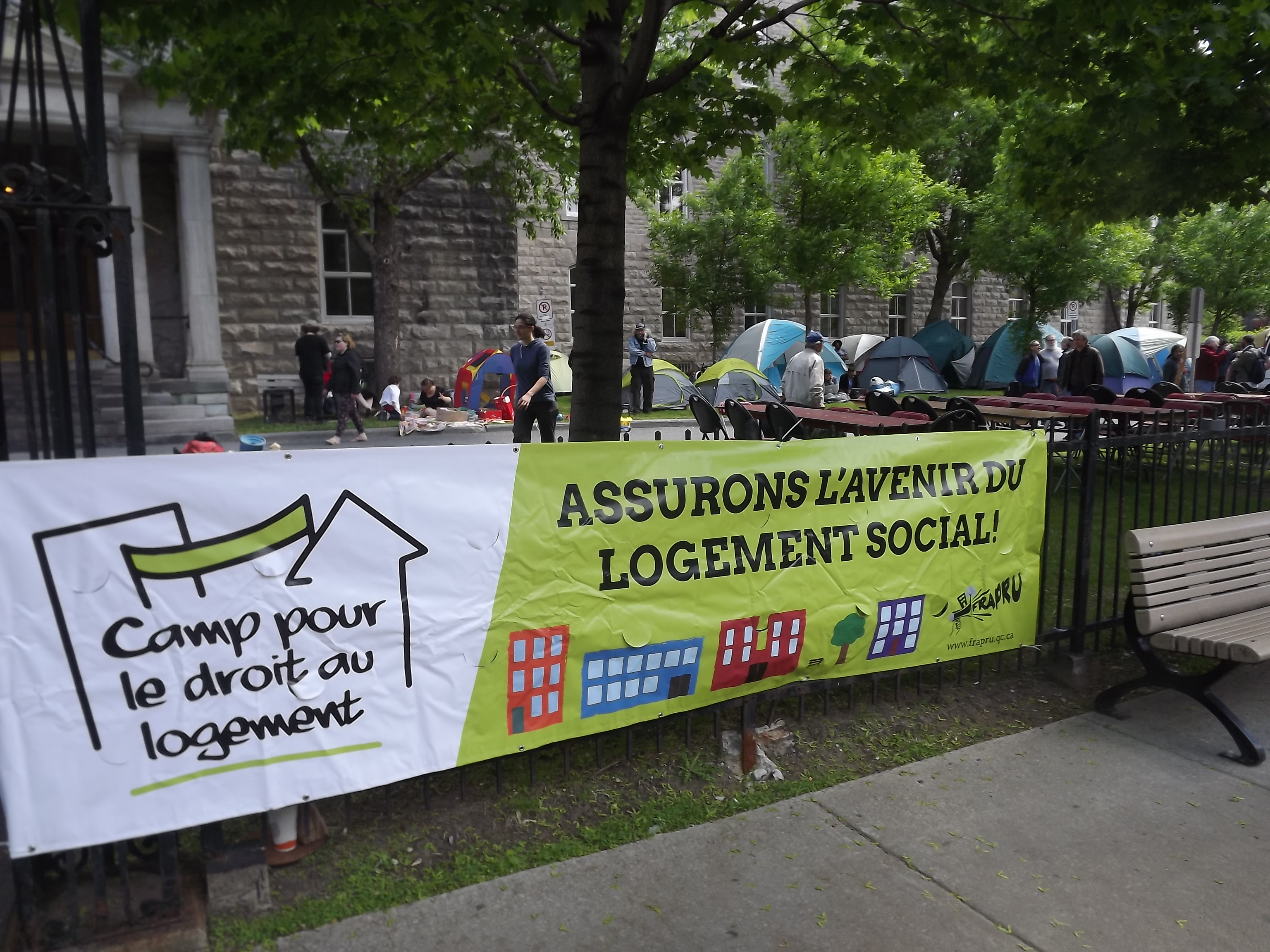 La centaine de campeurs du FRAPRU avaient choisi une propriété provinciale où le règlement municipal interdisant le camping dans les parcs ne s’applique pas, en l’occurrence le terrain de l’ancienne Agence de santé et des services sociaux de Montréal, dans l’arrondissement du Plateau Mont-Royal, un édifice presque vide depuis l’abolition de l’Agence par le gouvernement libéral.