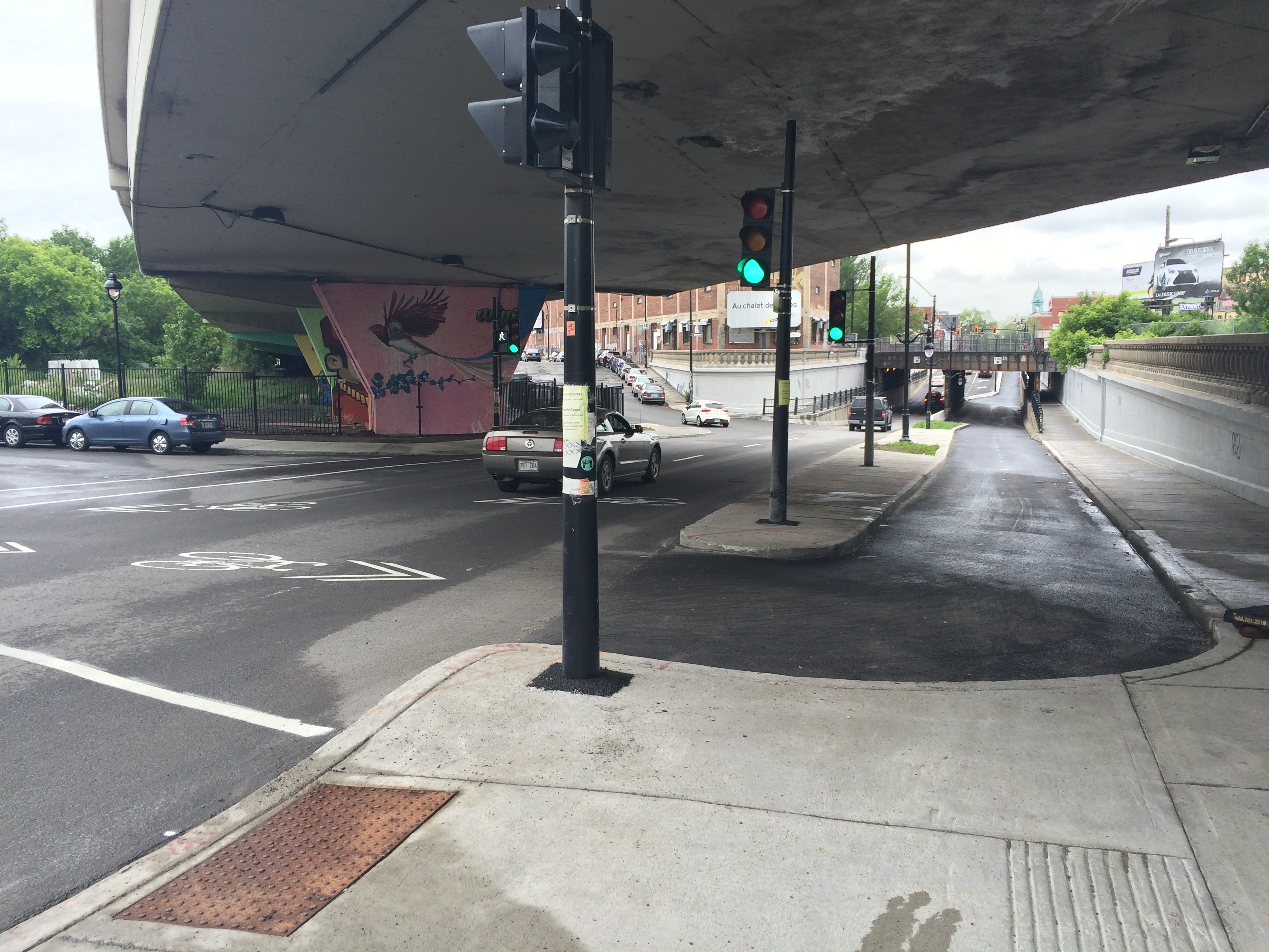 La ville-centre avait dans un premier temps effectué un marquage au sol pour clarifier la signalisation et mettre en garde les cyclistes provenant du sud du boulevard Saint-Laurent.