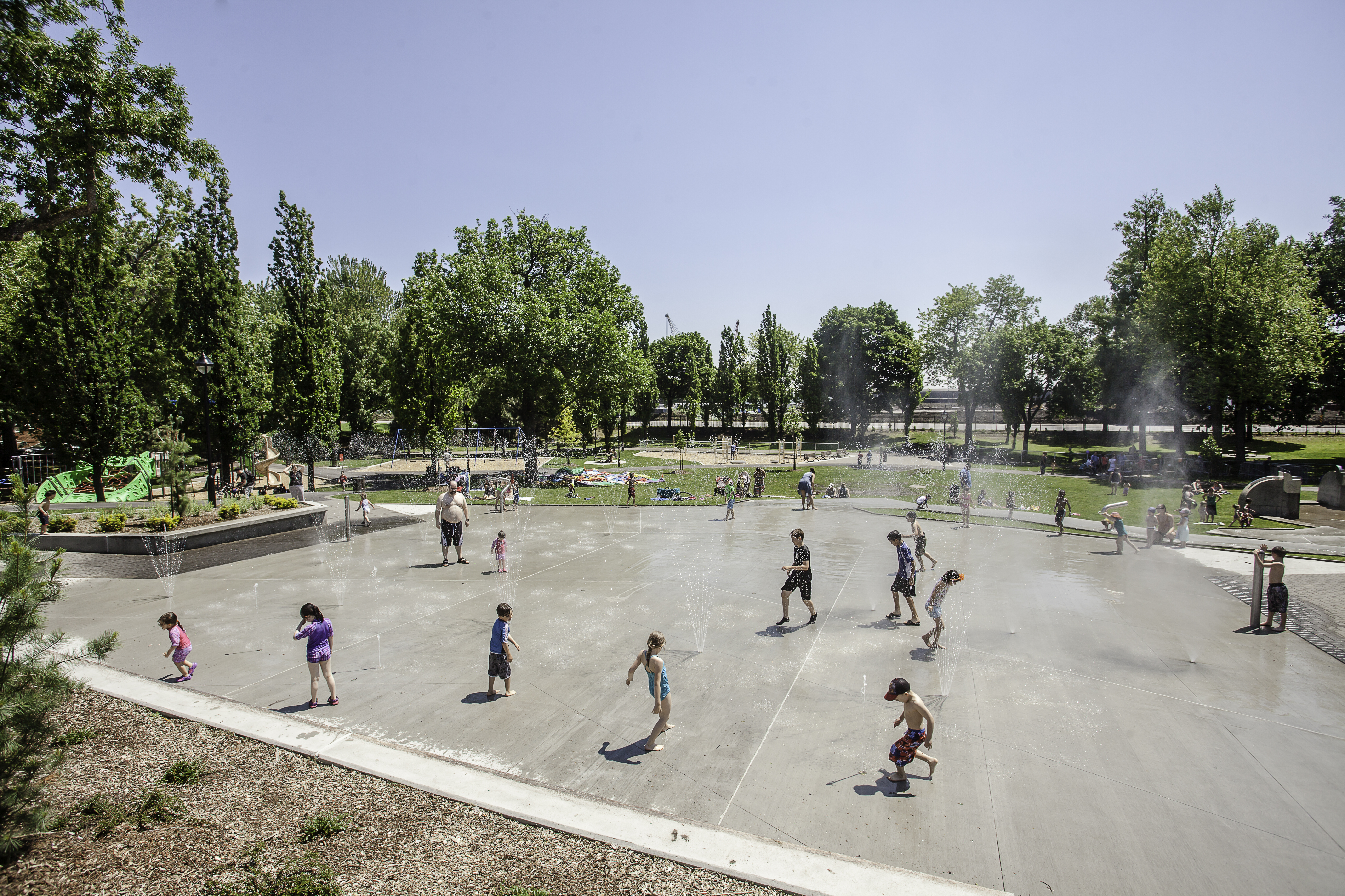 Au sud du parc, des jeux d’eau et des aires de jeu sécurisées pour les enfants se sont ajoutés à la place publique et à la fontaine, situées dans la partie nord.