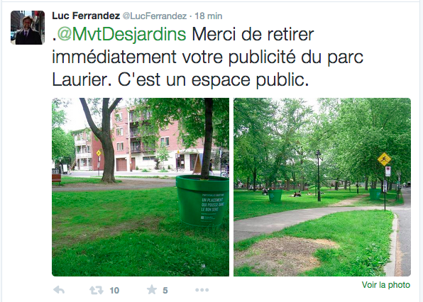Recouverts du message publicitaire de Desjardins, des cache-pots placés autour de plusieurs arbres du parc Sir-Wilfrid-Laurier ont fait bondir le maire du Plateau-Mont-Royal, jeudi après-midi. Luc Ferrandez a demandé le retrait immédiat de ces publicités du parc Sir-Wilfrid-Laurier via son compte Twitter.