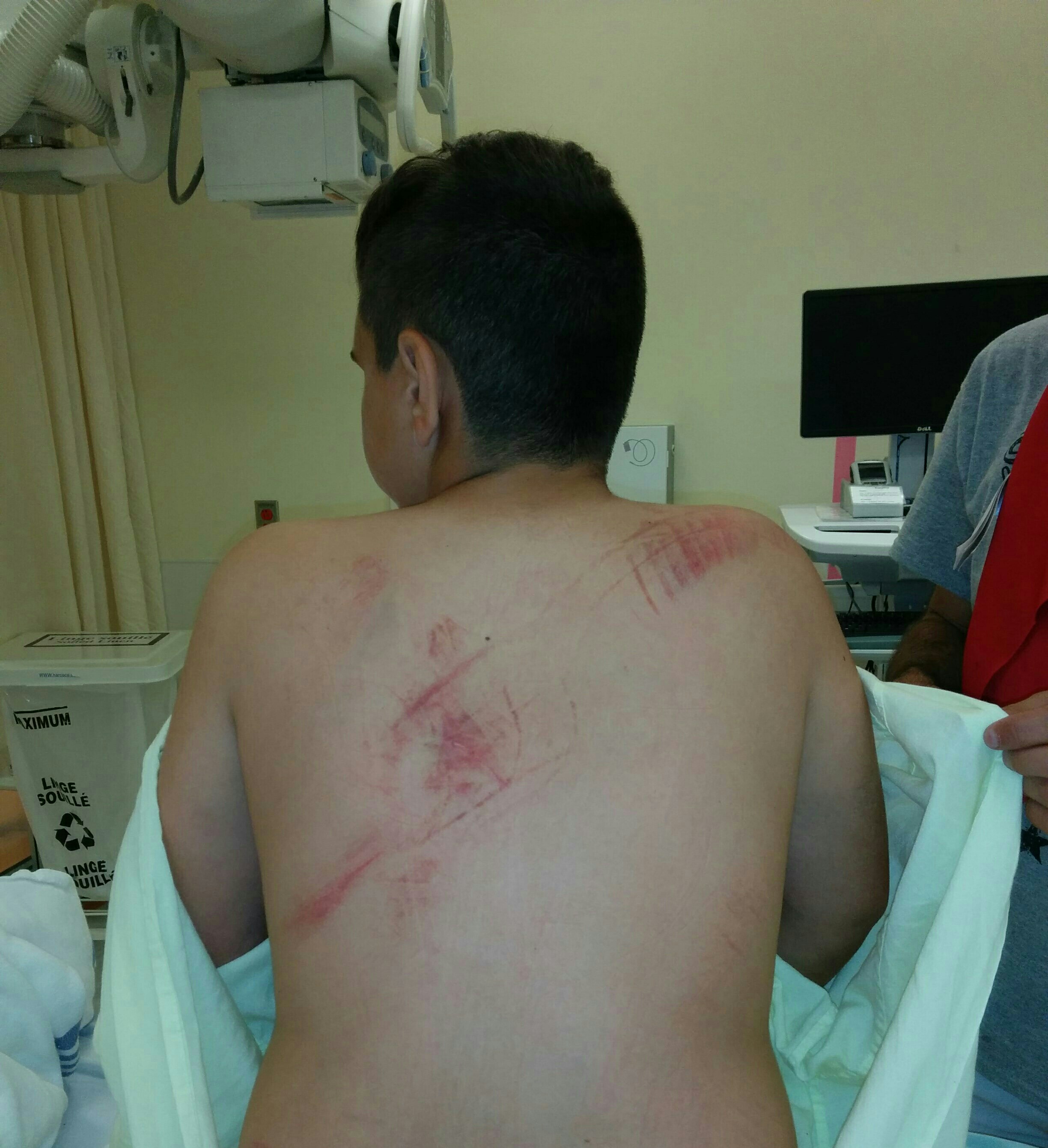 Signe que l’accident aurait pu être grave, des traces de pneus sont visibles sur son dos. Son chandail, lui, est déchiré.