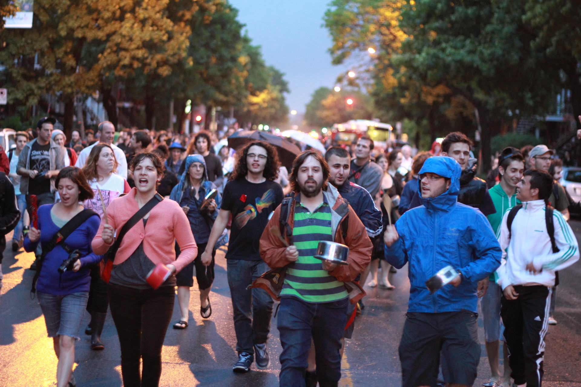 Quelque trois heures après que de violentes averses se soient abattues sur Montréal, causant des inondations et même la fermeture de certaines stations de métro de la ligne Orange, environ 200 personnes, plusieurs munies de leurs ustensiles préférés, se sont réunies à 20 h 30 à la place Émilie-Gamelin pour la 36e marche nocturne consécutive.