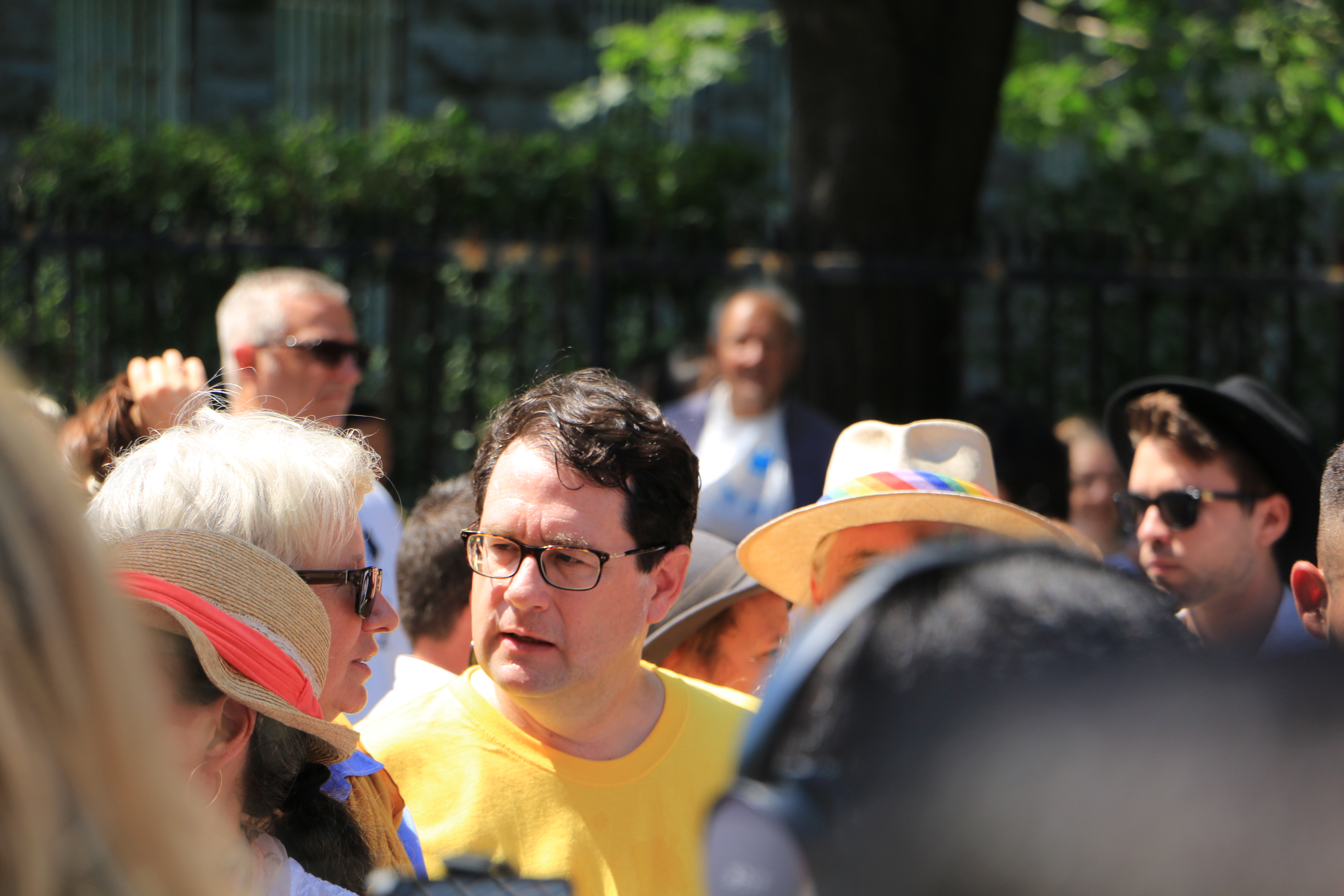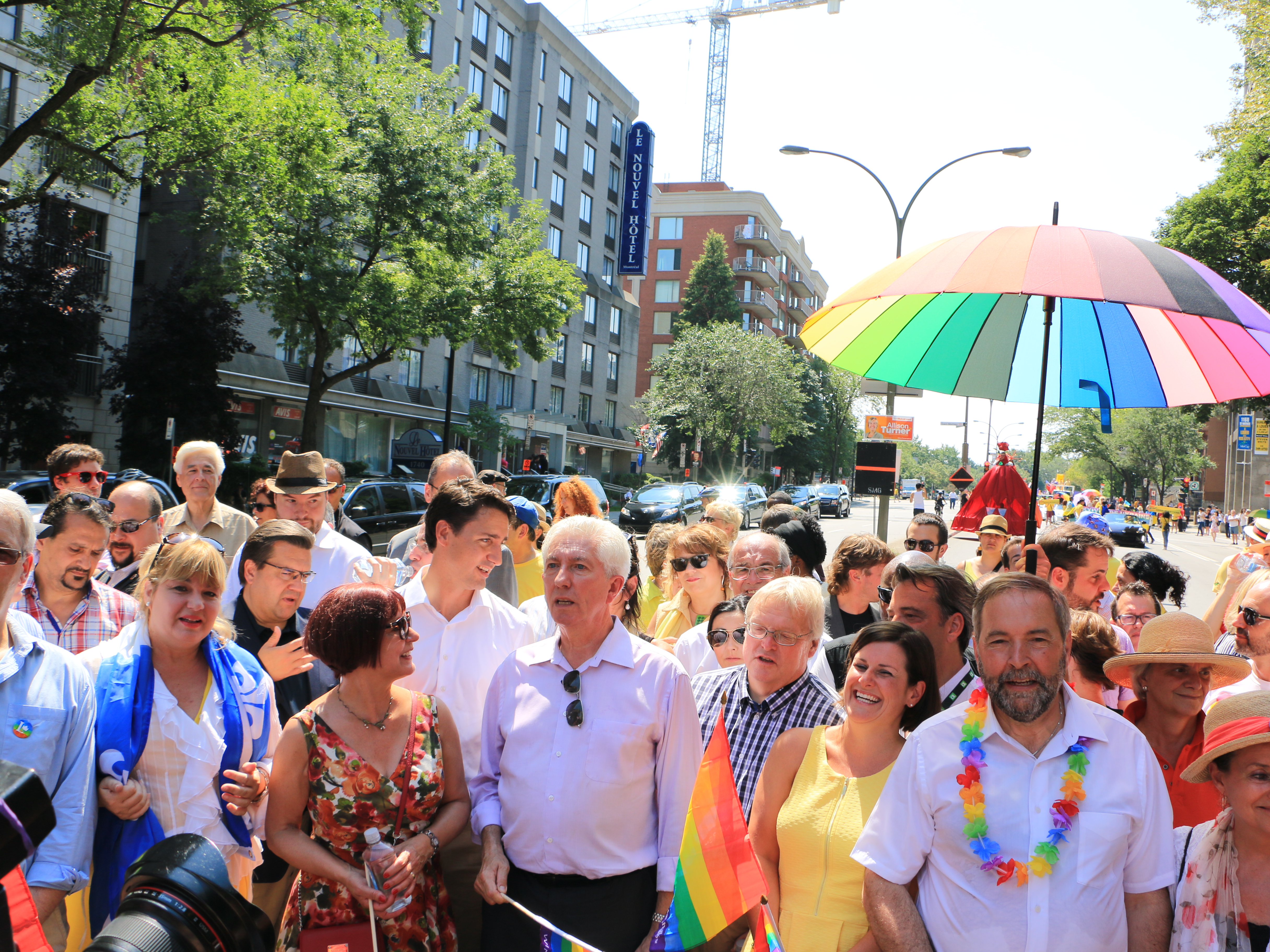 Une cinquantaine de politiciens de différents paliers de gouvernement étaient réunis à la célébration annuelle de la fierté LGBT (lesbiennes, gais, bisexuels et trans). Thomas Mulcair, Gilles Duceppe, Justin Trudeau et Elizabeth May ont chacun reconnu qu’il y avait beaucoup de travail à faire pour que les minorités sexuelles et identitaires, en particulier les personnes trans, obtiennent la pleine égalité. Il n’y avait toutefois aucun signe de Stephen Harper ni d’un député de son parti. Le Parti conservateur était représenté par les candidats montréalais Steve Shanahan et Richard Sagala.