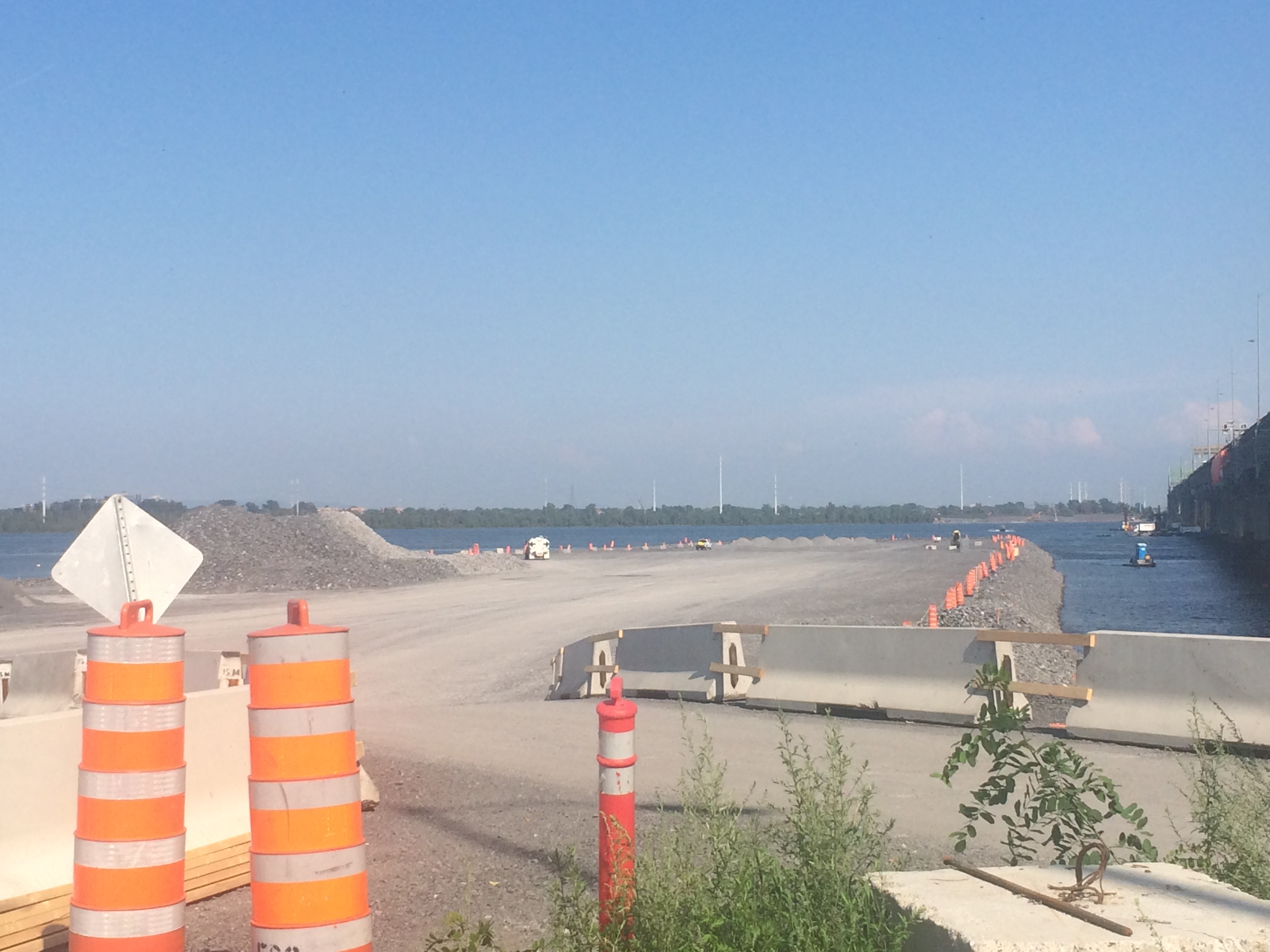 Le camionnage servant à l’enrochement de la jetée ouest s’est terminé il y a deux semaines. Depuis, le consortium a débuté les travaux de celle sur la Voie maritime. Pour ce faire, des camions chargés de pierres transitent par l’Estacade, de L’Île-des-Sœurs à la Rive-Sud.