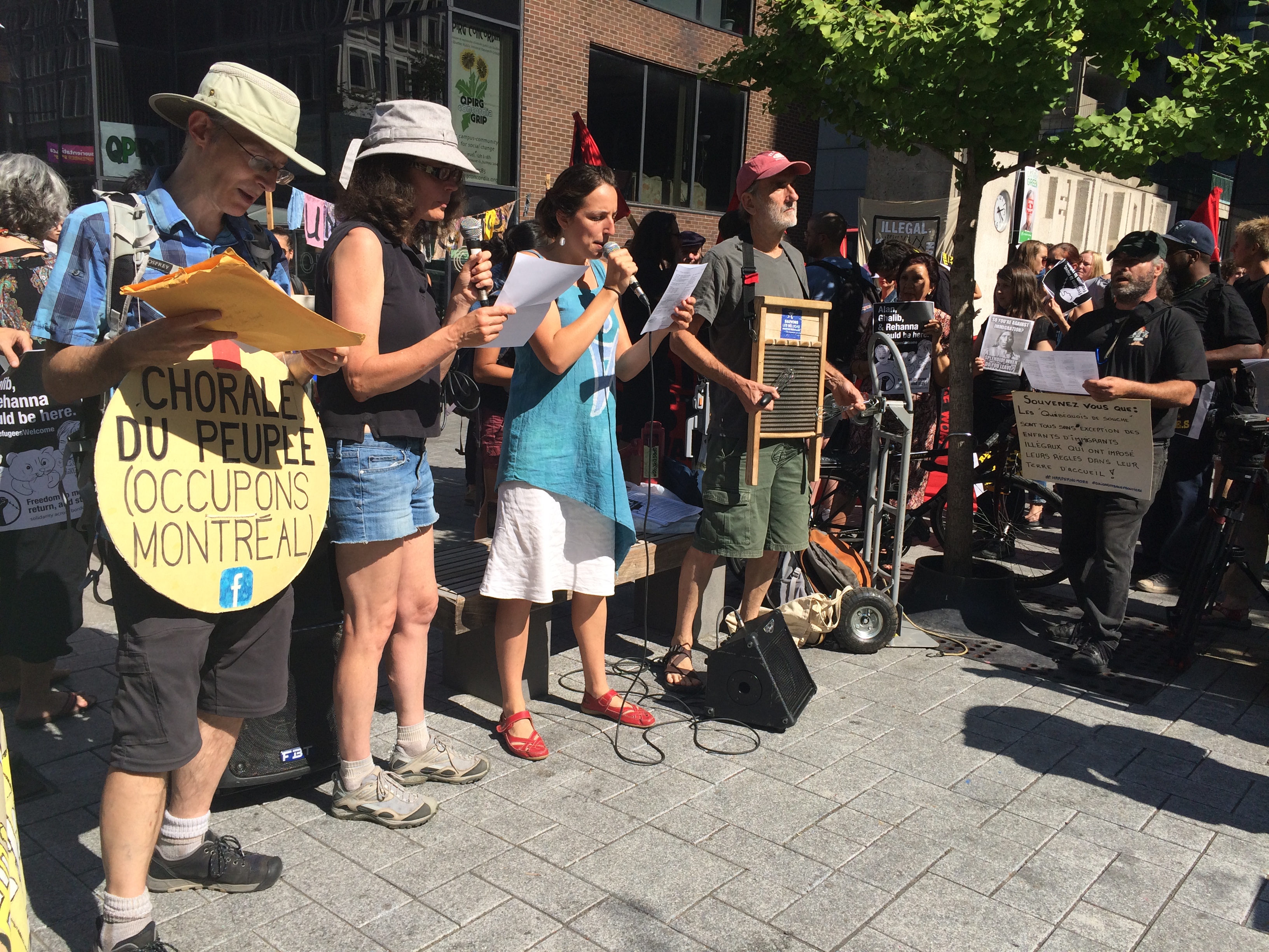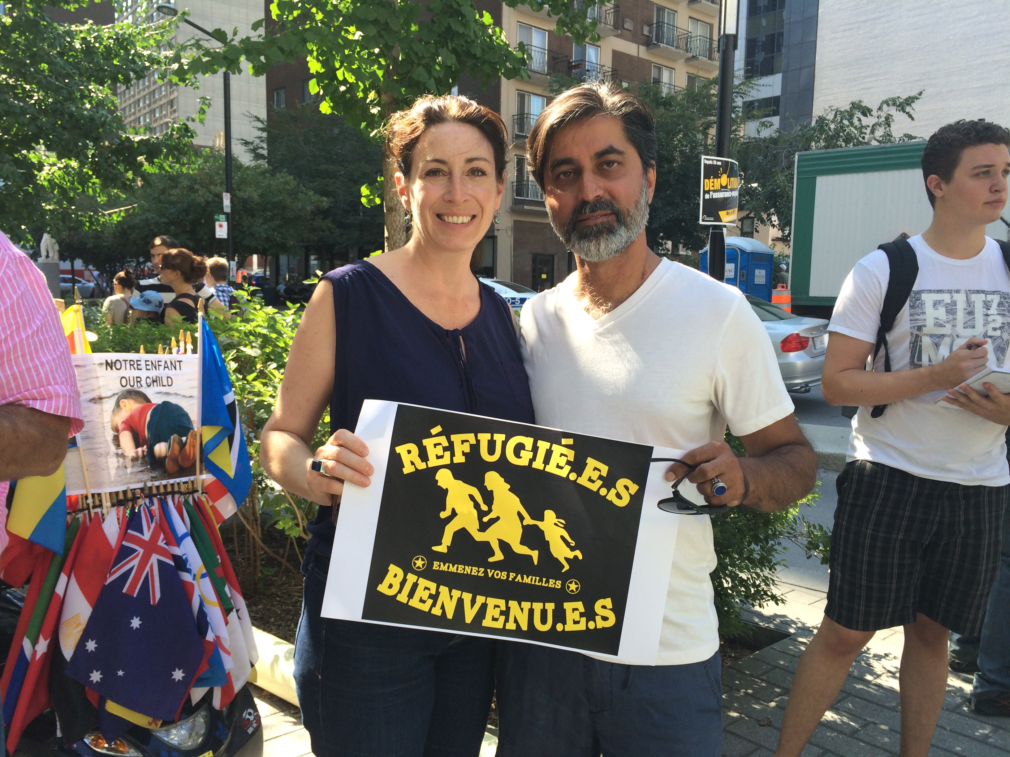 «On a besoin de dire bienvenue aux réfugiés comme l’Europe est en train de le faire. Et on est ici pour dénoncer la complicité du gouvernement Harper avec les morts de la famille Kurdi», a scandé Jaggi Singh, un des organisateurs, faisant référence à la photo du petit garçon syrien de trois ans mort, sur une plage de Turquie, qui a ému le monde entier cette semaine et ramené à l’avant-plan le débat sur les migrants.