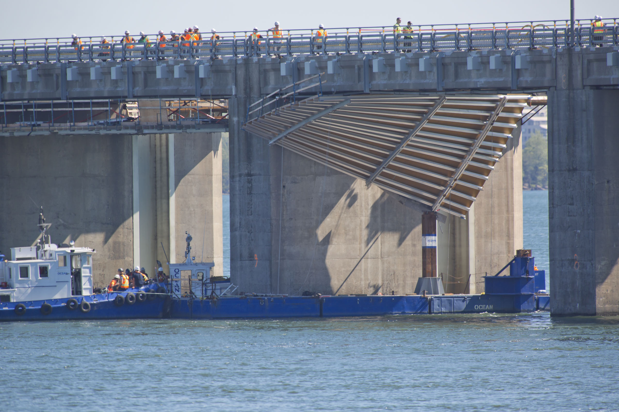 Après des recherches intensives entre l’estacade et le pont Victoria, les nombreux bateaux des services d’urgence ainsi que ceux du chantier, appuyés par l’hélicoptère de la SQ, ont concentré leurs efforts sous la structure qui s’est partiellement effondrée. Il a fallu un peu plus d’une heure pour localiser la dépouille de l’ouvrier au fond de l’eau, près du pilier.