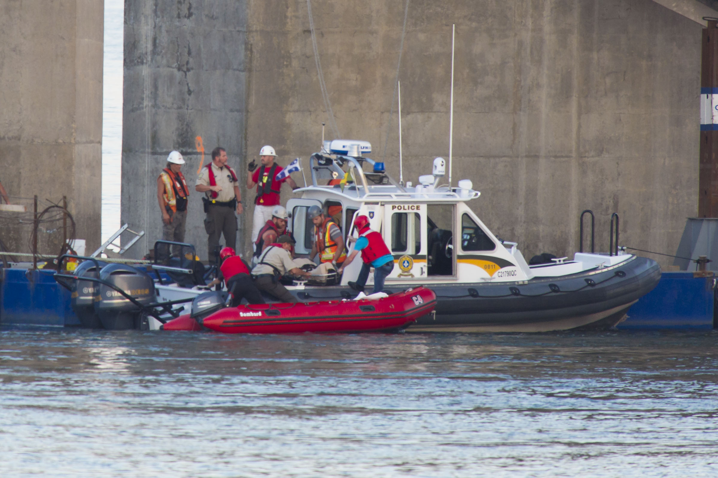 Après des recherches intensives entre l’estacade et le pont Victoria, les nombreux bateaux des services d’urgence ainsi que ceux du chantier, appuyés par l’hélicoptère de la SQ, ont concentré leurs efforts sous la structure qui s’est partiellement effondrée. Il a fallu un peu plus d’une heure pour localiser la dépouille de l’ouvrier au fond de l’eau, près du pilier.