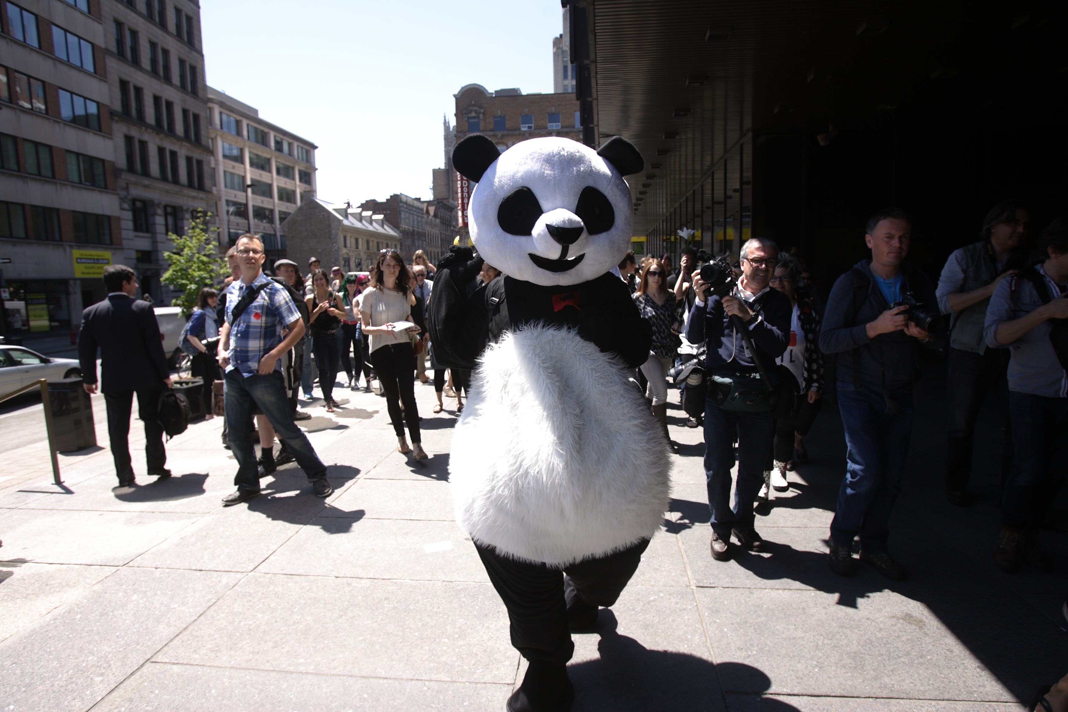 L’homme est arrivé devant le Palais de Justice de Montréal, mardi, sous les traits d’Anarchopanda. Accompagné d’une cinquantaine de personnes, il a invité la foule à marcher quelques mètres avant de déclarer: «ce que nous venons de faire ensemble, en vertu du règlement municipal P-6 est illégal.»