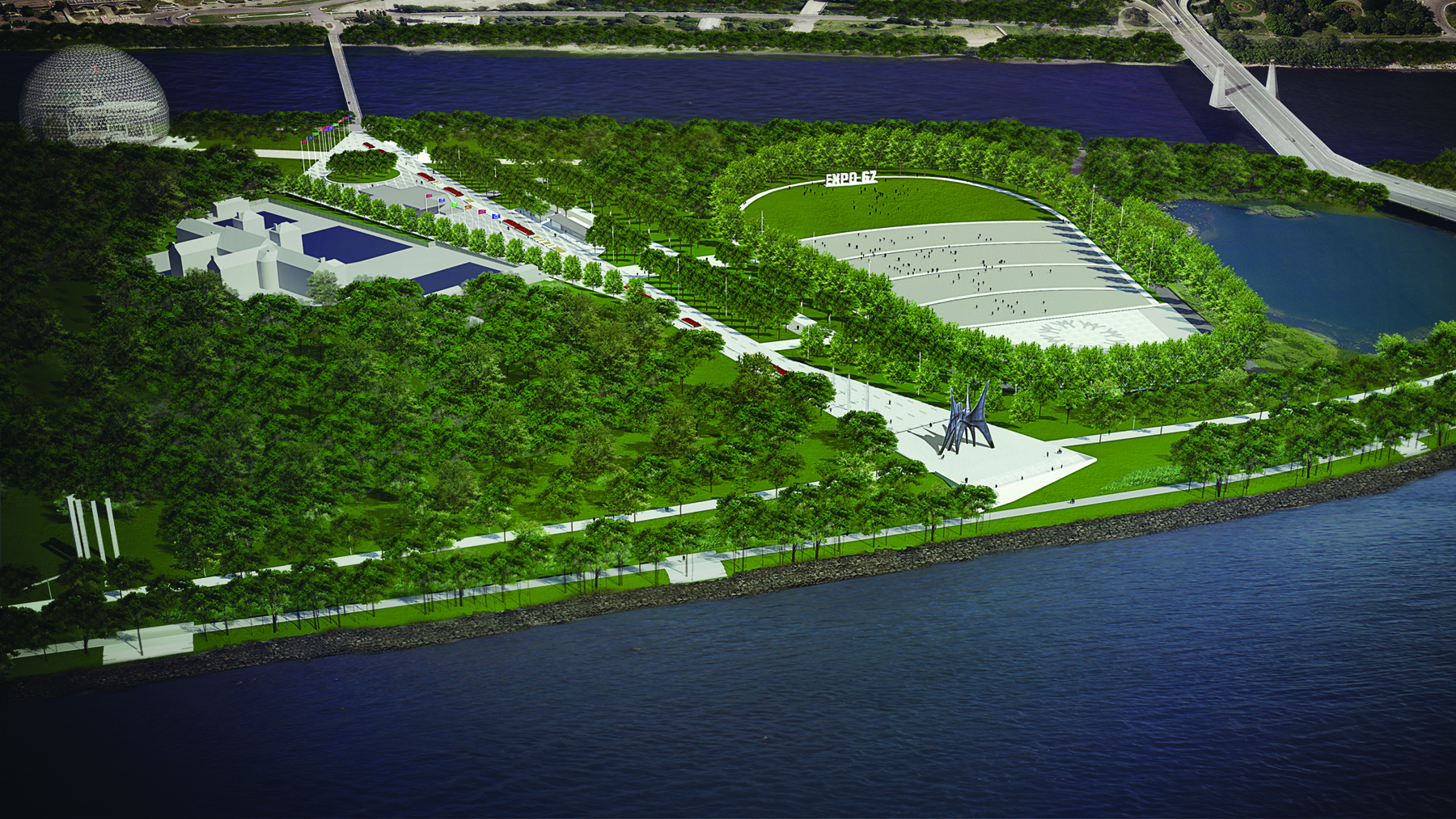En plus de l’amphithéâtre, la SPJD entend restructurer l’allée centrale, qui relie la station de métro Jean-Drapeau, la sculpture de L’Homme de Calder, la Biosphère et le pont du Cosmos, qui donne accès à l’île Notre-Dame, tout ceci dans le cadre du 375e anniversaire de la Ville de Montréal. Le projet verra toutefois le jour seulement en 2019.