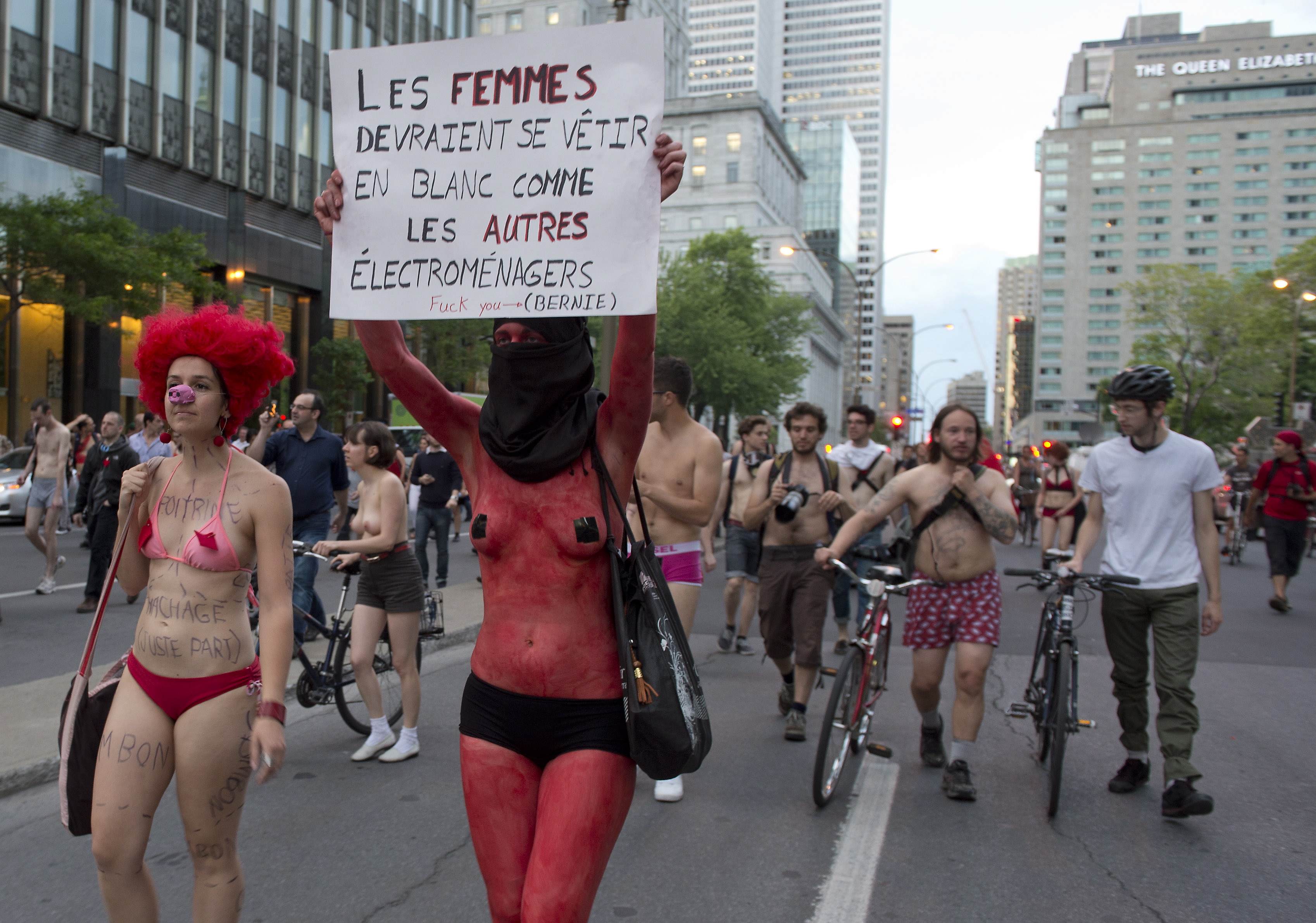 L’Association facultaire des étudiants en arts de l’UQAM avait invité les manifestants à s’exprimer dans leur plus simple appareil, pour exprimer leur rejet de l’étiquetage social imposé par la société de consommation.