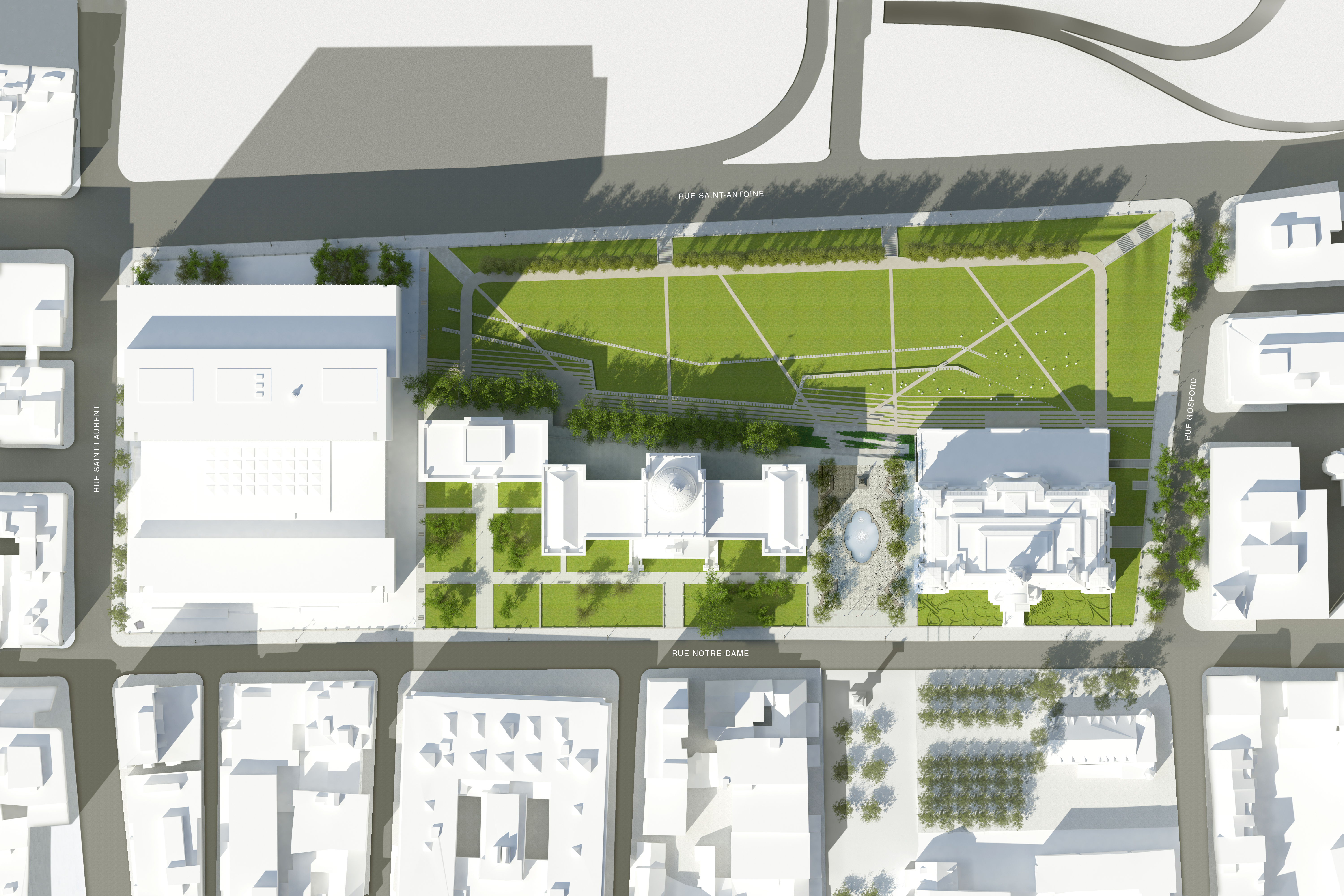 La Place Vauquelin sera rehaussée de 40 à 60 cm et la vue sera dégagée, ce qui permettra un regard non seulement sur le Champ de Mars, au nord, mais aussi sur le Vieux-Montréal et la Place Jacques-Cartier, au sud.