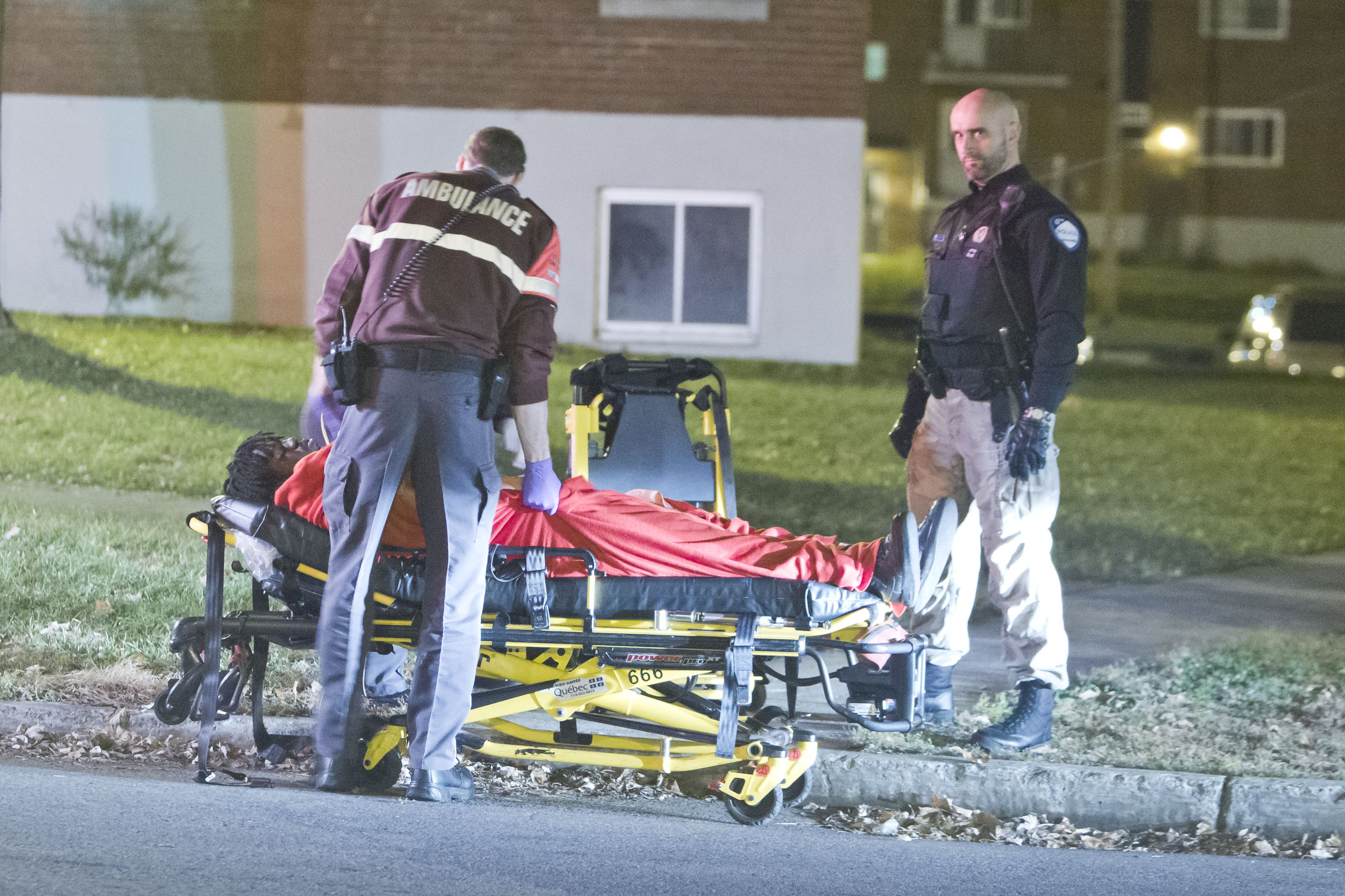 Transporté au centre hospitalier pour une lacération à une jambe, on ne craignait pas pour sa vie. Un maître-chien a été demandé sur les lieux. Deux suspects ont été localisés ainsi qu’un sac contenant l’arme du crime.