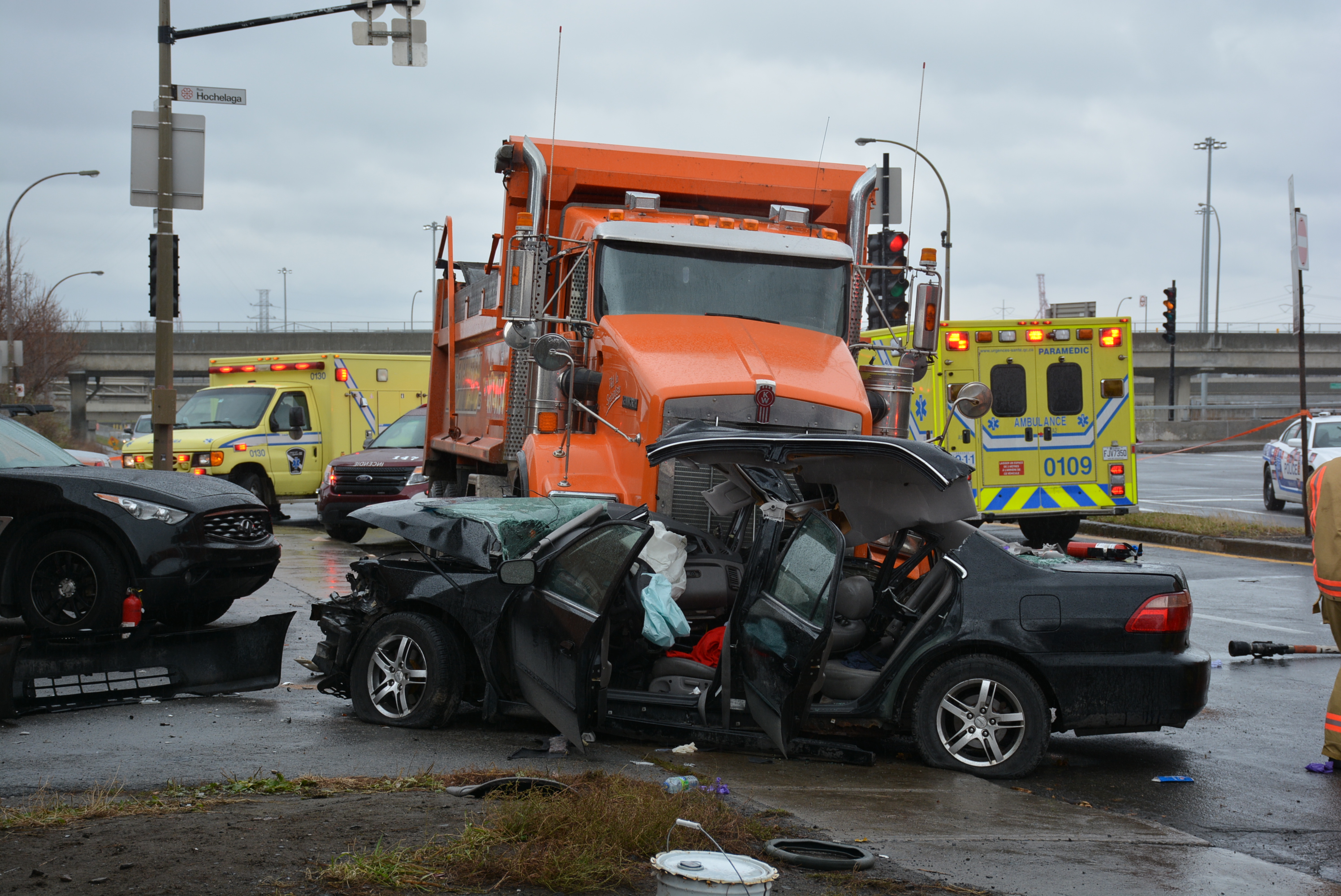 Selon les informations policières, l’automobile circulait en direction sud rue de Boucherville lorsqu’elle a entrepris un virage à gauche rue Hochelaga. Elle a alors été percutée par le camion qui se dirigeait vers le sud de la rue Curatteau avant de pouvoir compléter son virage.