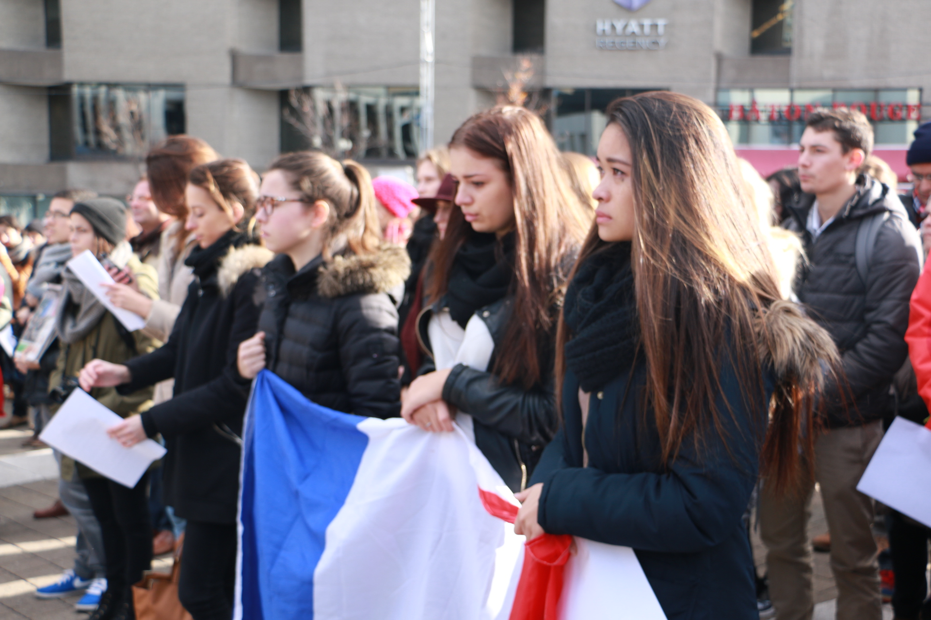 Trois jours après la vague d’attentats qu’a connu Paris, l’Esplanade de la Place des Arts a accueilli lundi midi des centaines de Montréalais venus observer une minute de silence en hommage aux victimes. Le rassemblement qui s’inscrit dans un mouvement de solidarité et de paix a également eu une pensée pour les victimes des attaques terroristes de jeudi à Beyrouth, au Liban. Le maire Denis Coderre ainsi que des personnalités politiques et des artistes ont tour à tour pris la parole afin d’exprimer leur soutien à la France.