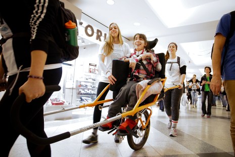 Une dizaine d’étudiants en technique d’éducation spécialisée ont effectué un rallye dans le centre-ville de Montréal dimanche. Sa particularité? Ils devaient porter des personnes à mobilité réduite sur leur dos ou les traîner dans un fauteuil tout-terrain.