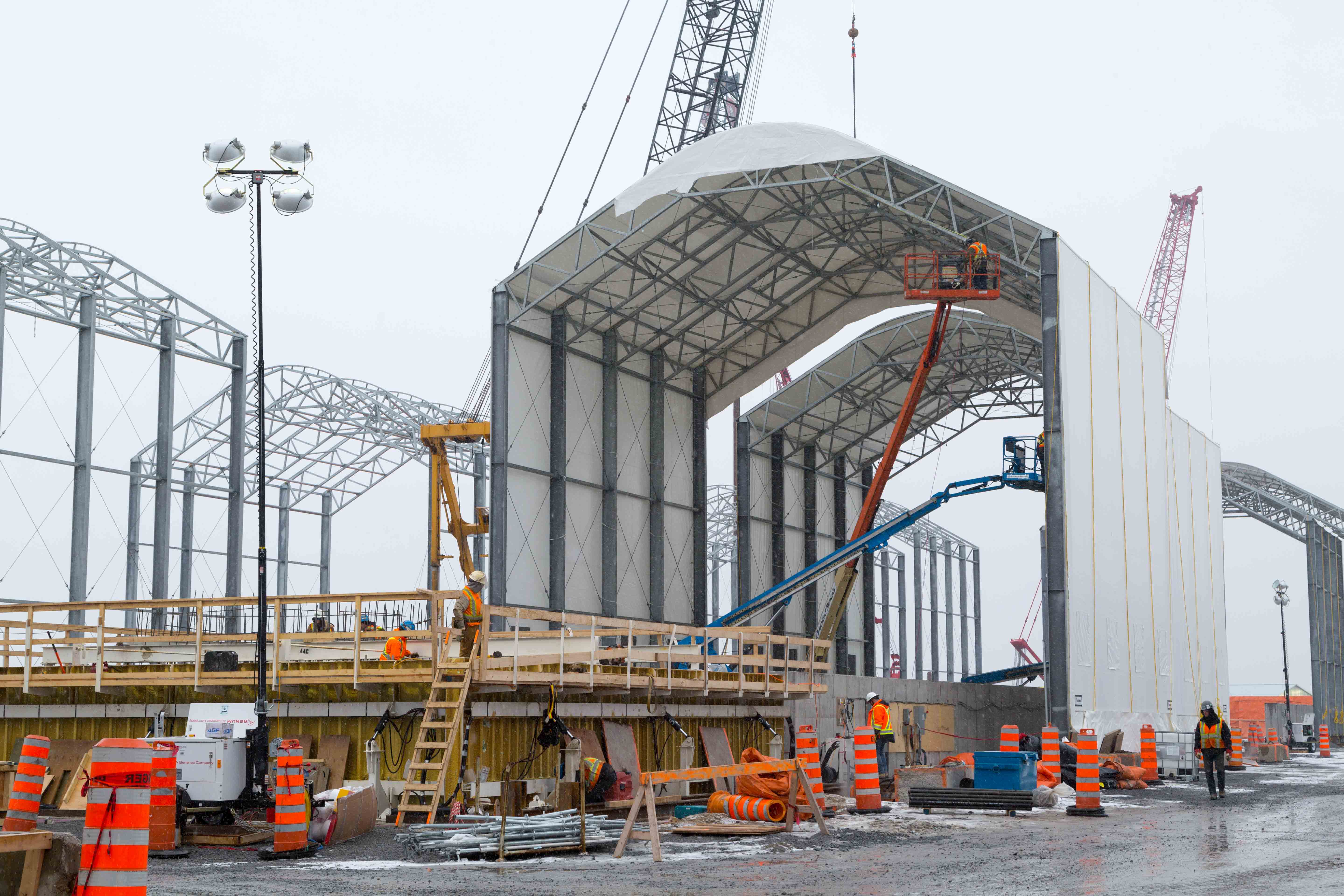 Des grues et des dômes ont fait leur apparition sur le chantier de construction du pont Champlain au cours des dernières semaines. Ils permettent, depuis le 11 janvier, la construction de la culée ouest du pont, qui assurera la connexion de la structure sur L’Île-des-Sœurs.