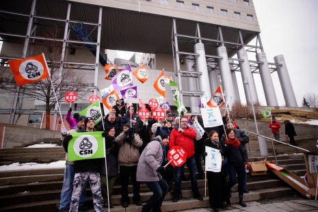 Une cinquantaine de personnes ont manifesté jeudi, à l’invitation de la Confédération des syndicats nationaux (CSN), la tenue d’un colloque faisant la promotion des partenariats entre le public et le privé en santé à HEC Montréal.