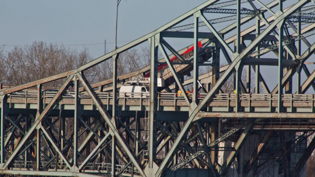 Quand le poids lourd de 53 pieds a emprunté le pont en direction de Montréal, la benne s’est détachée en heurtant le pont. Le camionneur n’a pas été blessé et a pu quitter avec son camion, mais il est revenu sur les lieux pour rencontrer les policiers.