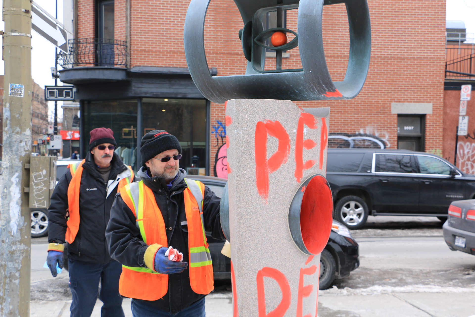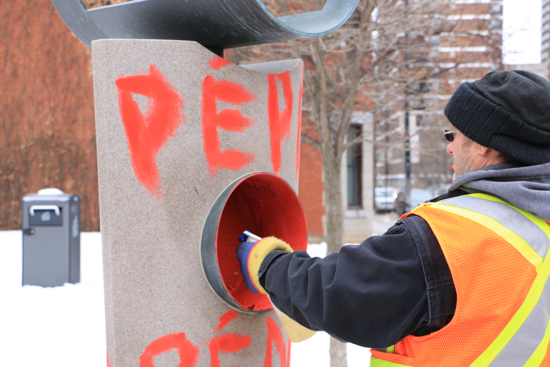 Des cols bleus ont été mandatés pour nettoyer l’œuvre. «Ça nous prend un produit spécial pour enlever la peinture sur le bronze, sans l’endommager. Faut la sauver, l’œuvre. Après, ils feront ce qu’ils voudront avec», indique un des peintres restaurateurs de la Ville de Montréal, James Kenpran.