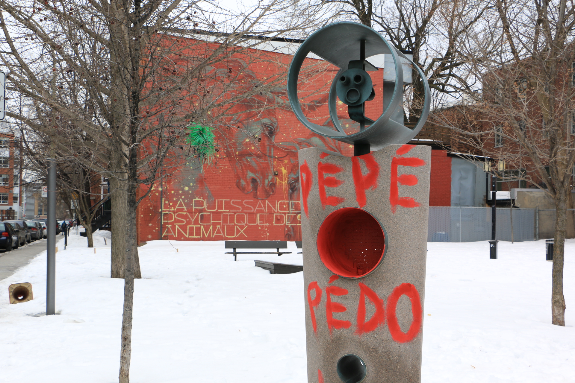 L’oeuvre à la mémoire du cinéaste Claude Jutra a été vandalisée au cours des dernières heures. «Pépé Pédo» a été inscrit à la peinture rouge sur la sculpture érigée en 1997 dans le petit parc à son nom au coin des rues Clark et Prince-Arthur, dans le Plateau – Mont-Royal.